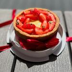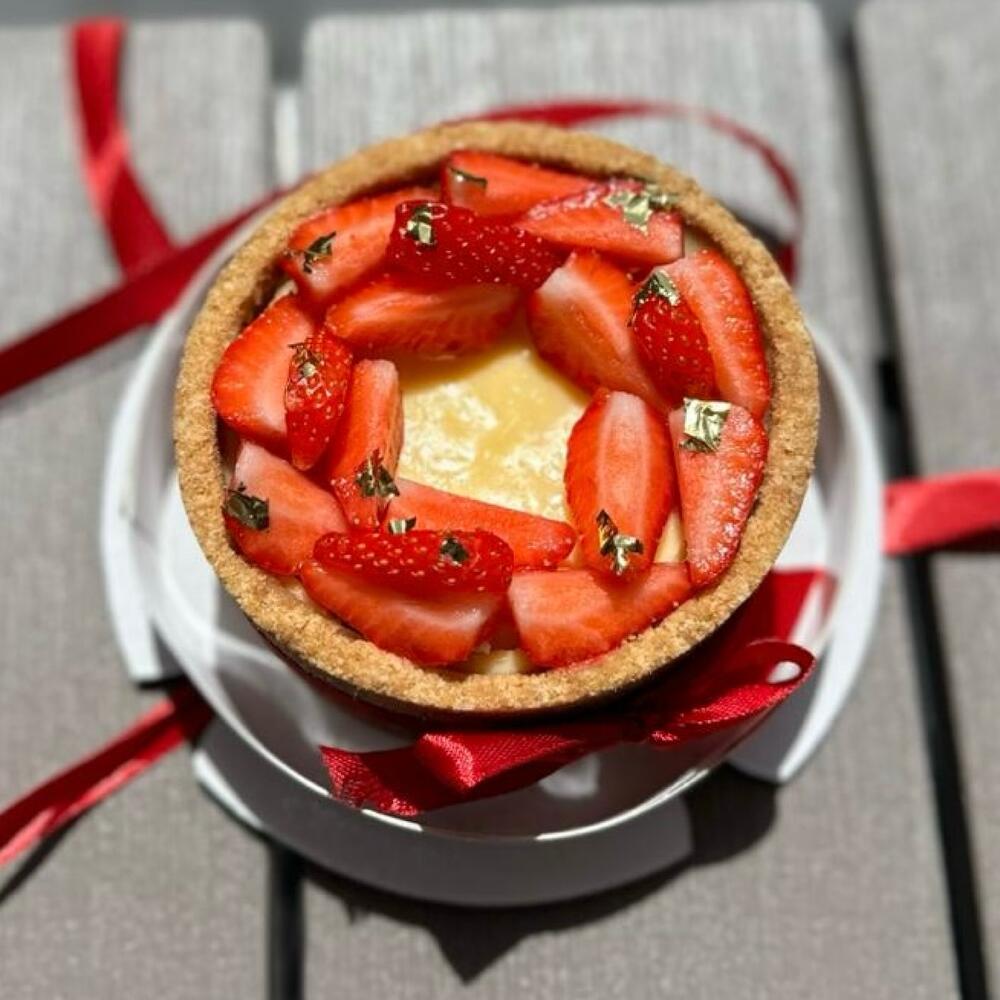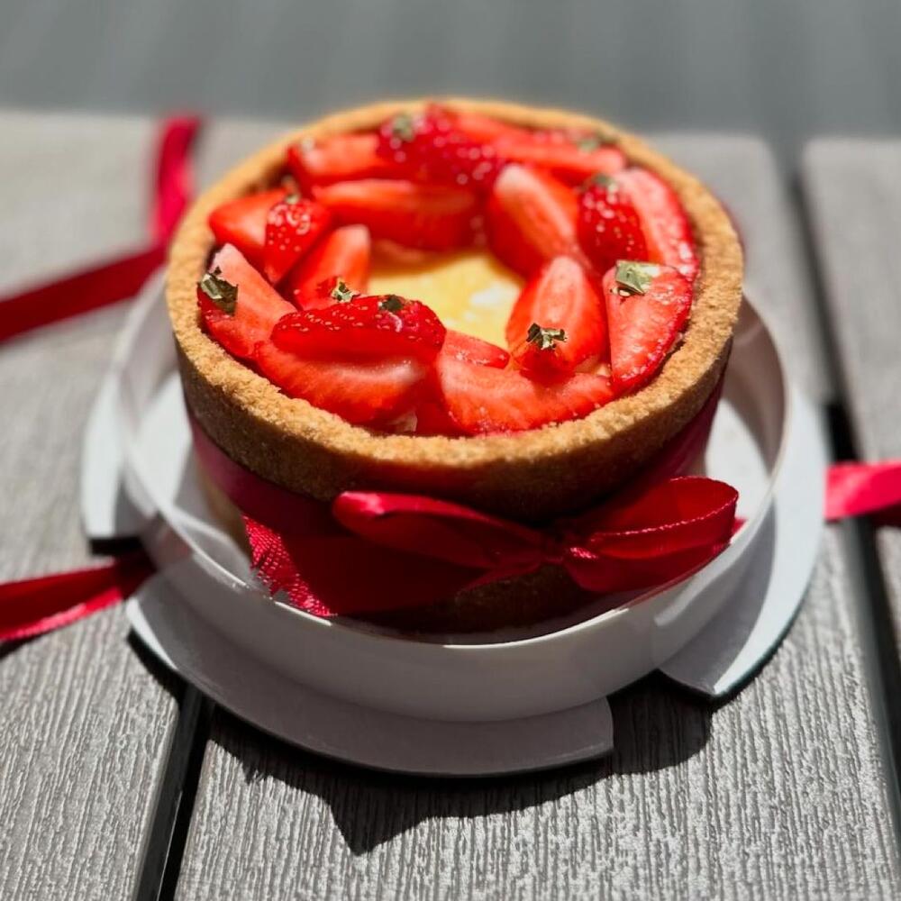 Песочное печенье Сливочное масло Творожный сыр Сливки Яйца Сахар Декор клубника Коробка Атласная лента