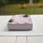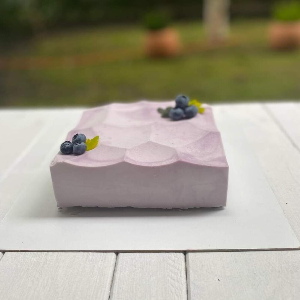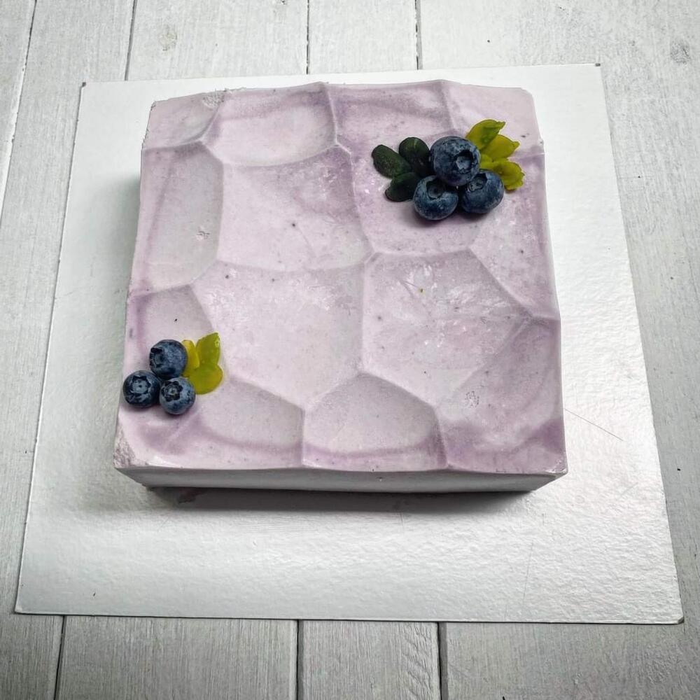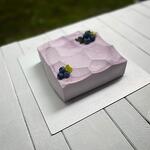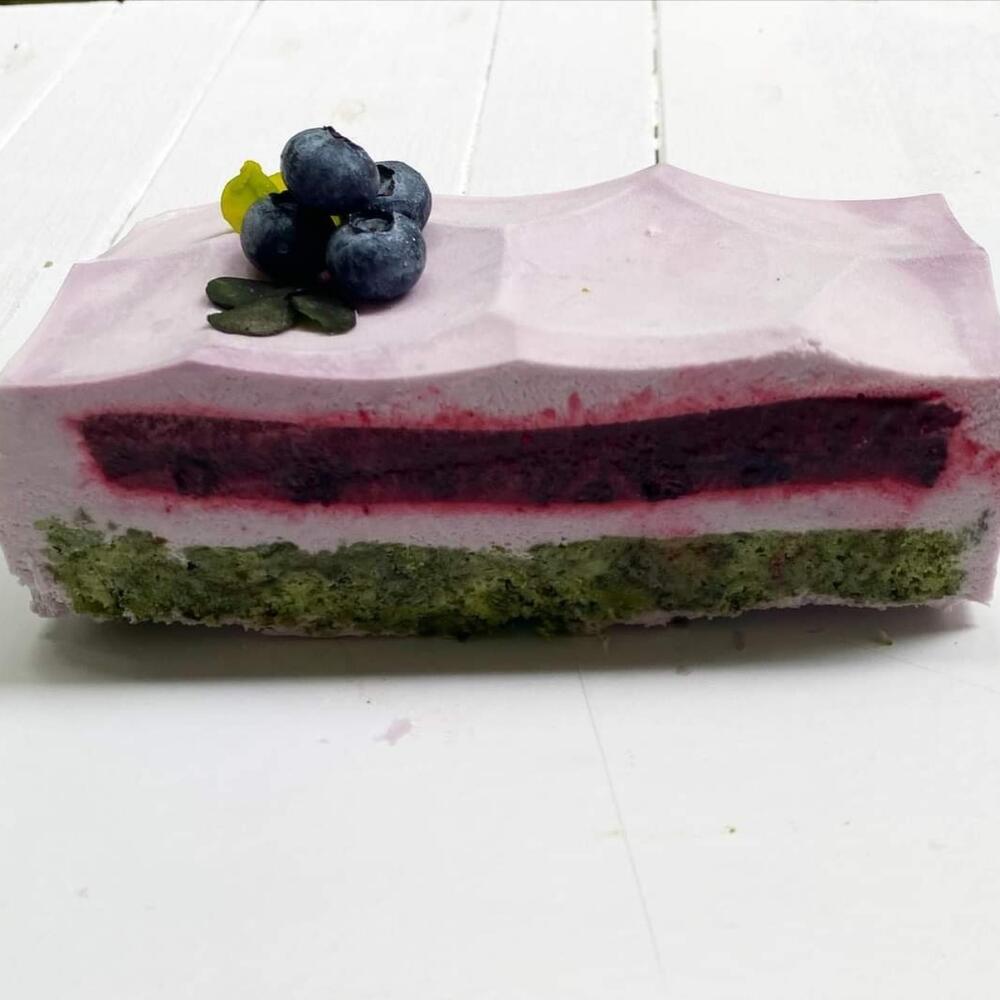 Biszkopt z szpinakiem: szpinak, jajko, cukier, mąka pszenna, proszek do pieczenia, limonka Śmietanka, jagoda, lawenda, żelatyna Decor : płatki migdałowe, barwnik, borówka