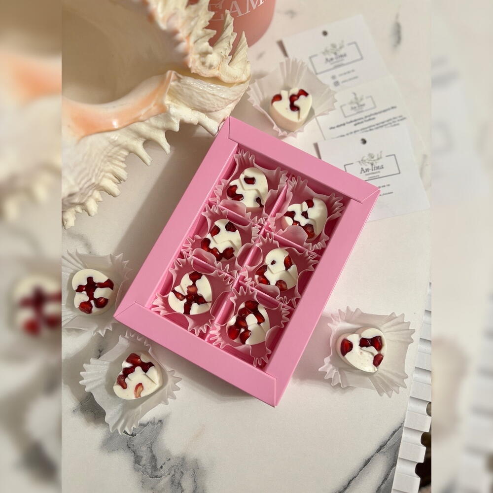 Шоколадные сердечки изготовлены из белого шоколада. Сырье - Callebaut бельгийский шоколад. Callebaut белый шоколад - какао масло, какао, молоко цельное сухое, эмульгатор соевый лецитин, ароматизатор натуральный ваниль,сахар Добавки: зерна граната