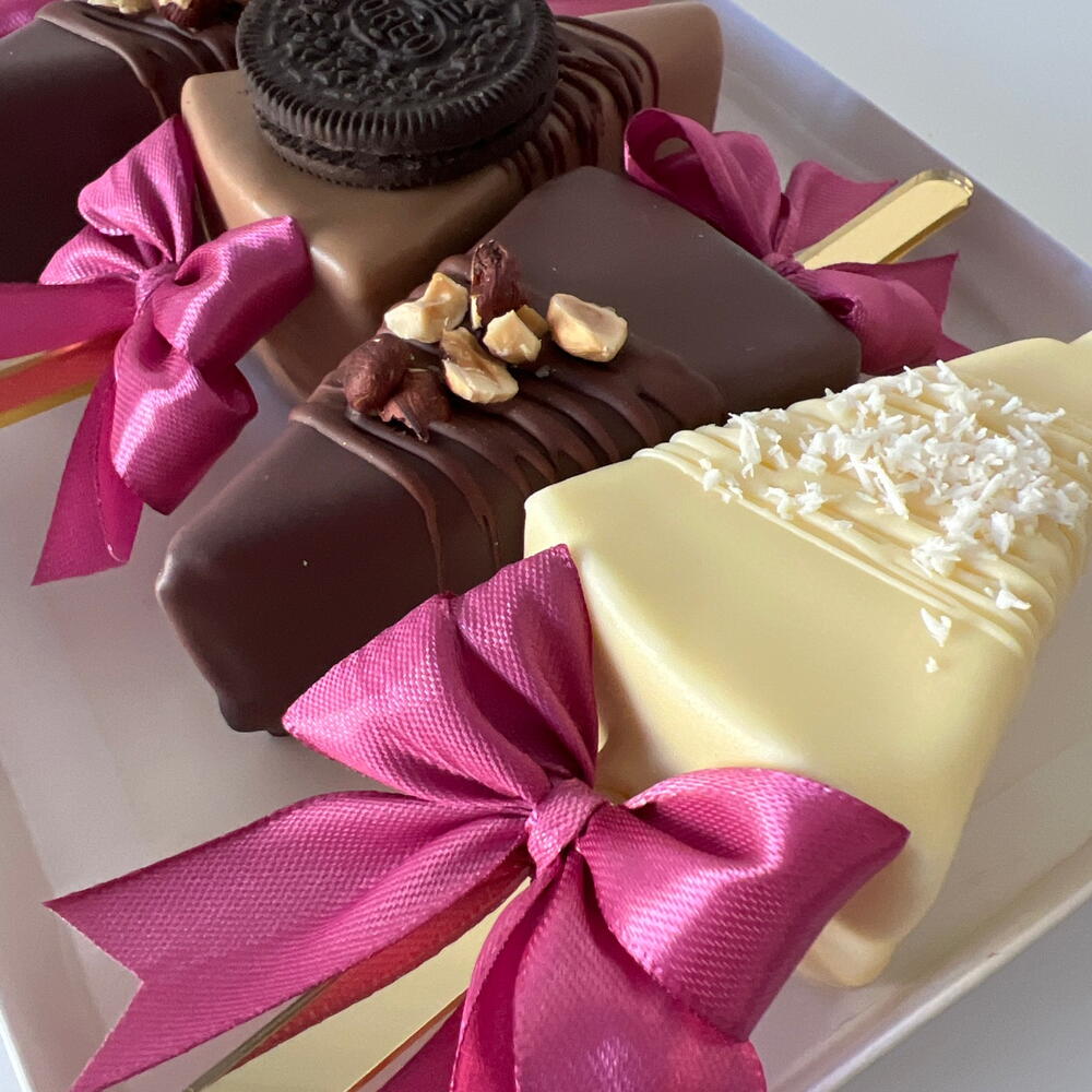 Zestaw serników w czekoladzie. 3 sztuki o smaku czekoladowo-orzechowym, 2 sztuki o smaku kosos-marakuja. W zestawie 5 sztuk.