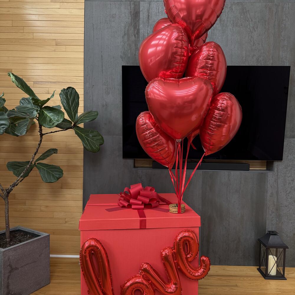 Meglepetés doboz, piros szín 70*70*70 cm beleértve 10 piros szívet