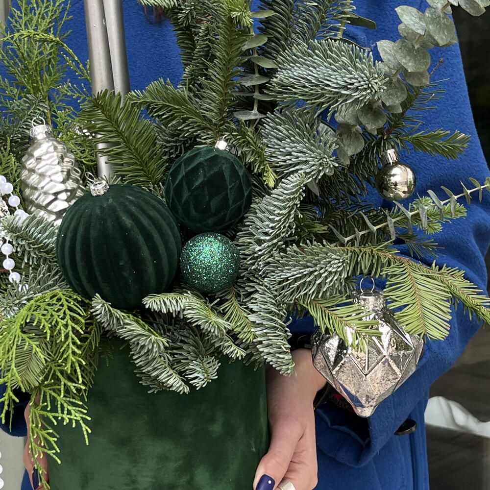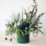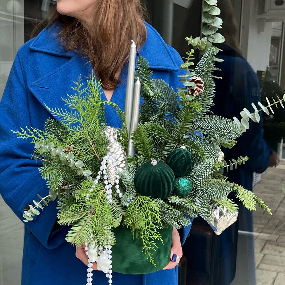 Spruce arrangement in a basket. The fragrant needles do not shed and will delight you throughout the holidays. It is perfect as a gift or as décor for any space. The candles can be replaced once they burn down.