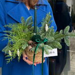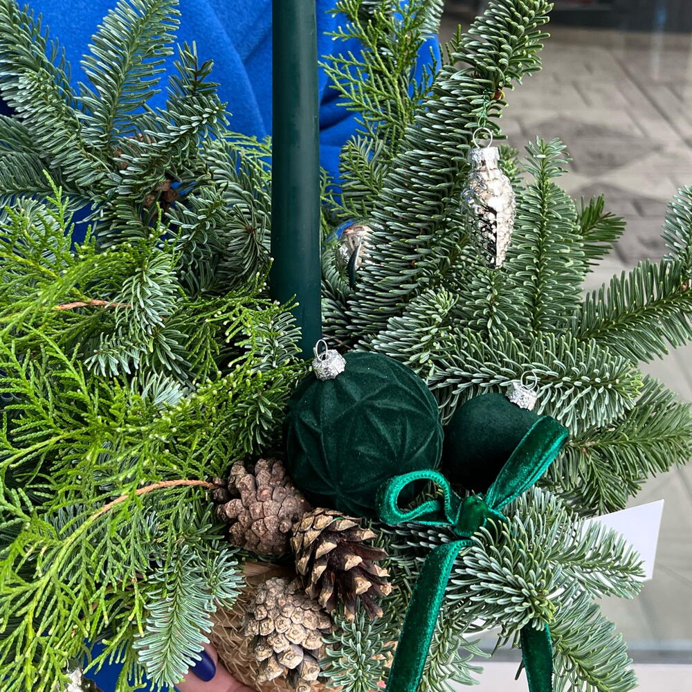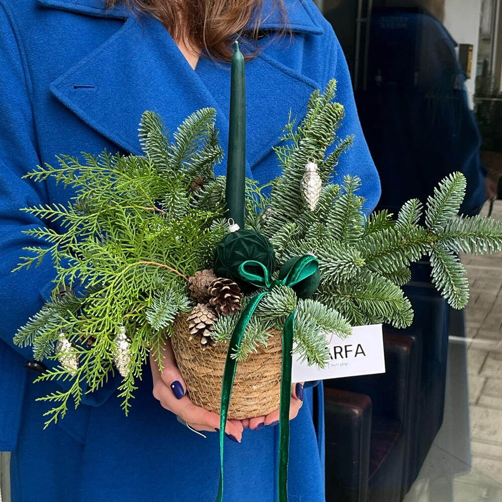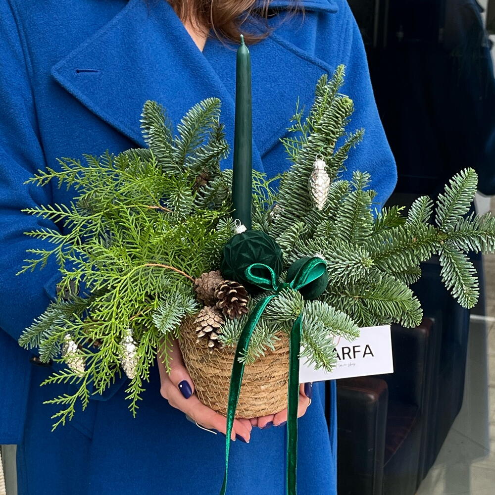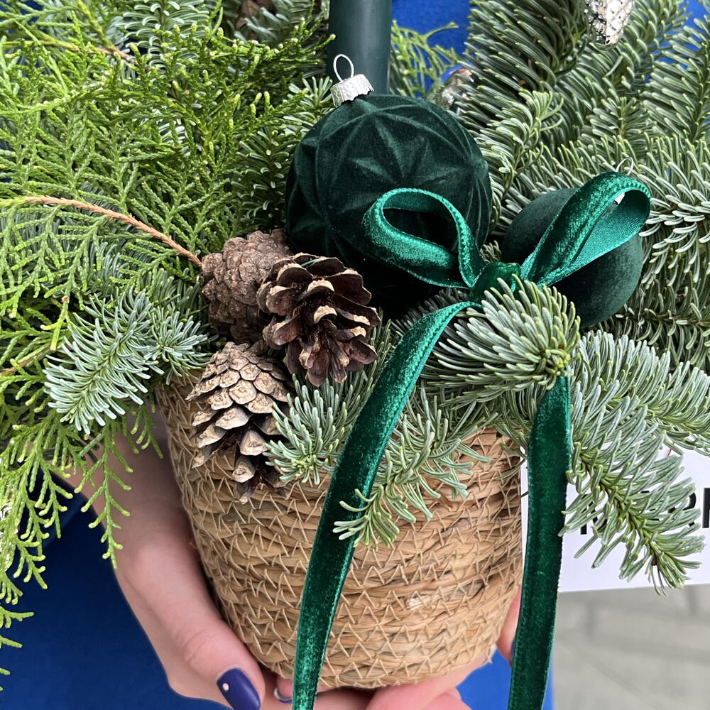 A basket made of fragrant pine needles with a candle. The needles don’t shed, and the candle can be replaced with a new one once it burns down. It will bring joy throughout the holidays. Perfect as a gift or as home décor.