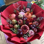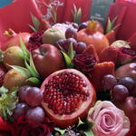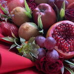 apples - 5 db. kiwi - 4 db. grapes - 150 g eper - 300 g csomagolópapír - 3 db. card - 1 db. gránátalma - 3 db. rózsák - 5 db.