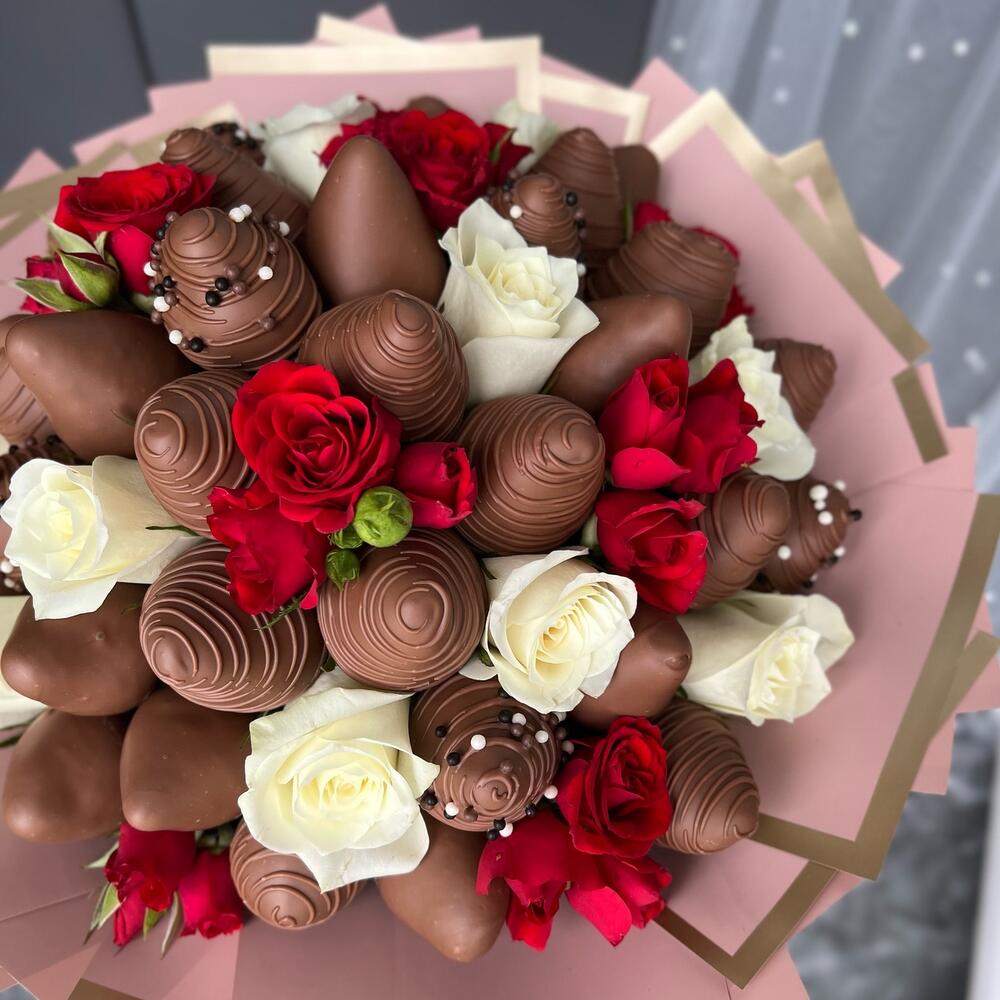 Bouquet chocolate-covered strawberries and roses