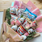 Kinder bueno - 4 db. Nutella go - 1 db. rózsa - 5 db. csomagolás - 1 db. kinder chocolate mini - 1 db. kinder country - 2 db. card with wishes - 1 db. kinder suriprise - 5 db.