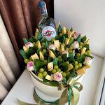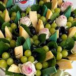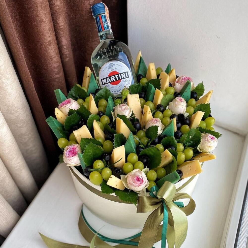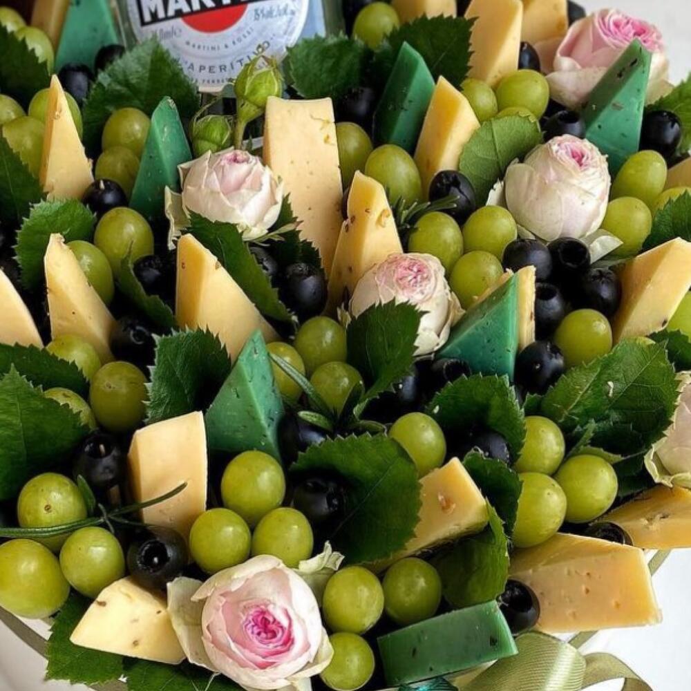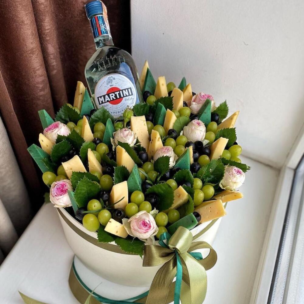 Коробка шляпная - 1 db. Роза пионовидная - 7 db. Оливки - 150 g Сыр твердый - 200 g декоративная зелень - 5 db. оливки зеленые - 150 g martini bianco (0.5 л) - 1 db. сыр твердый цветной - 200 g