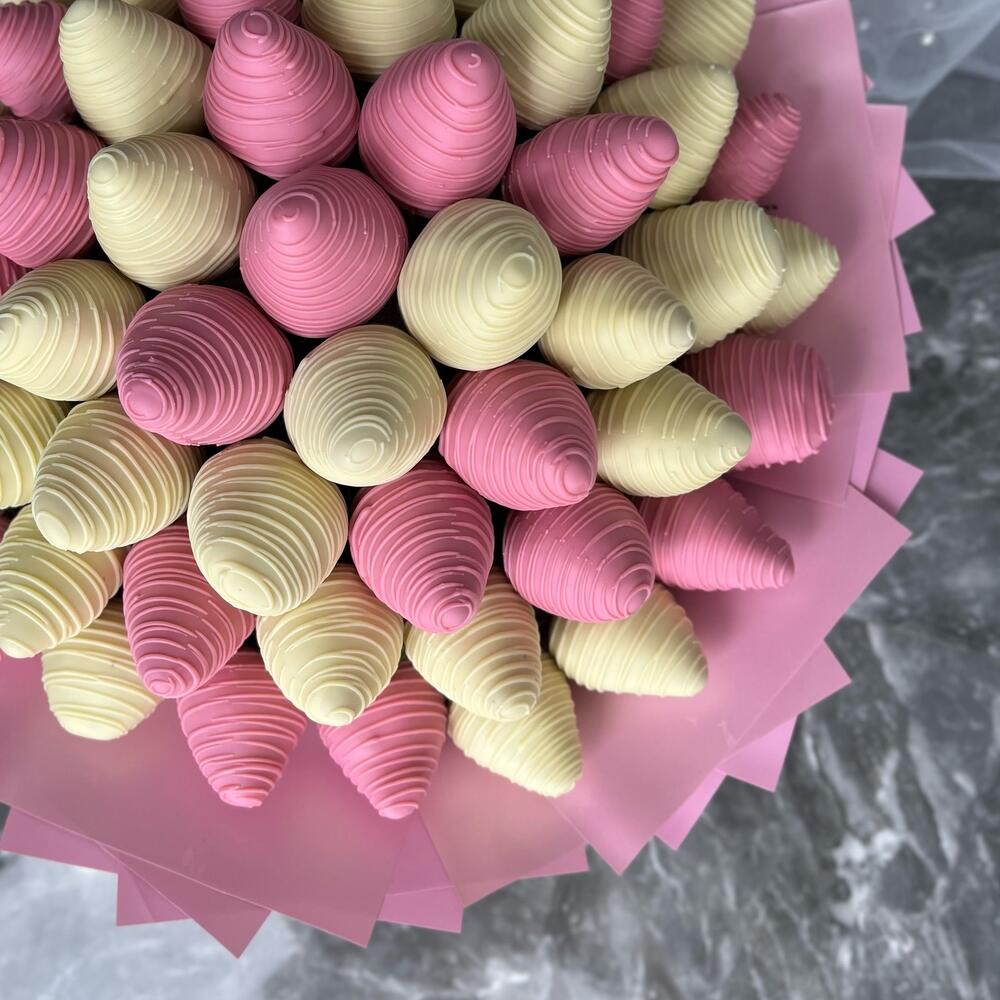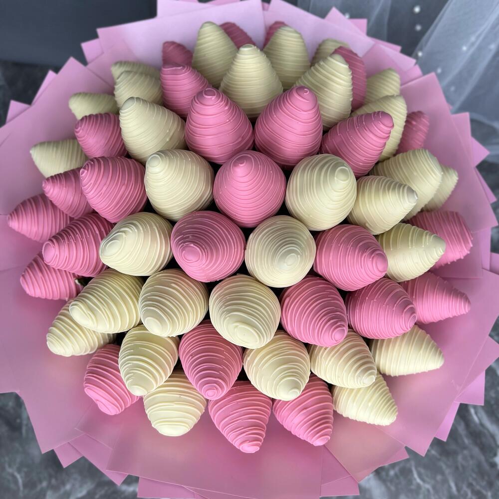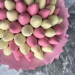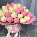 Delicate bouquet of strawberries in chocolate Callebaut. Number of berries ~ 60 pcs. Pink packaging.