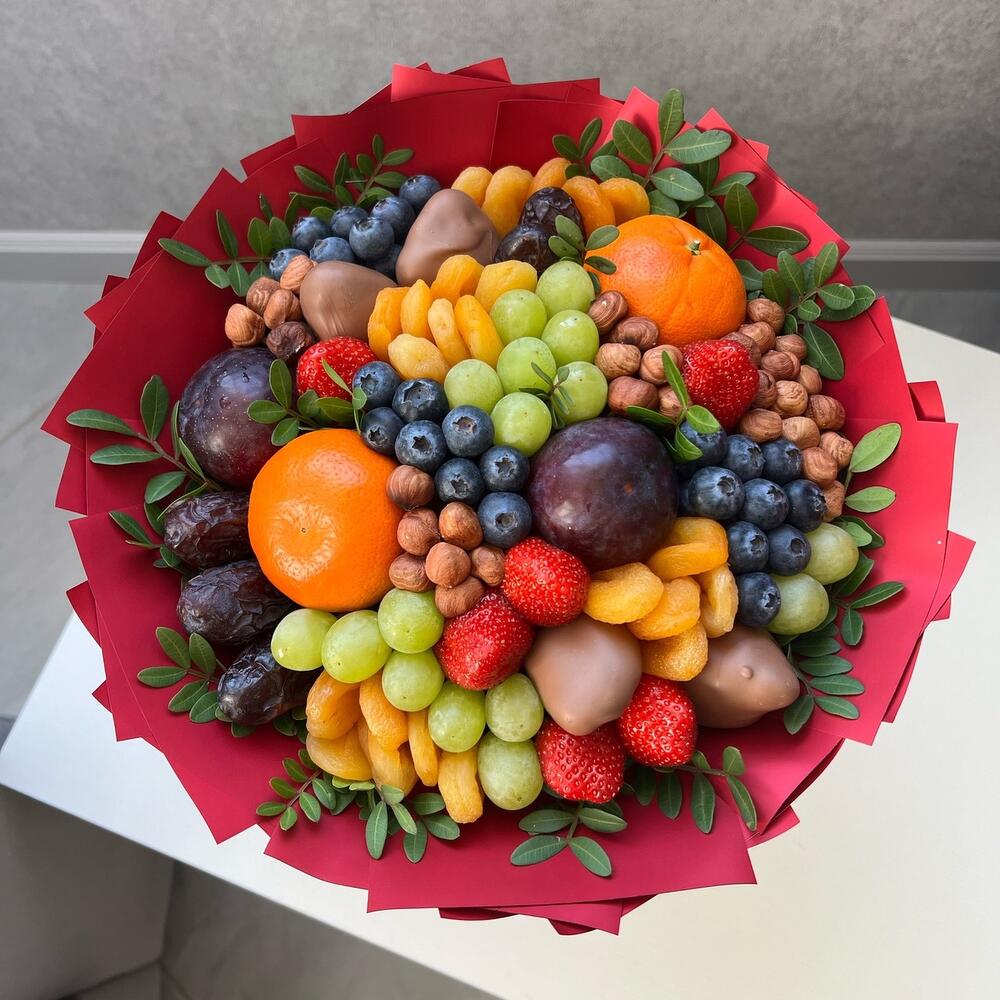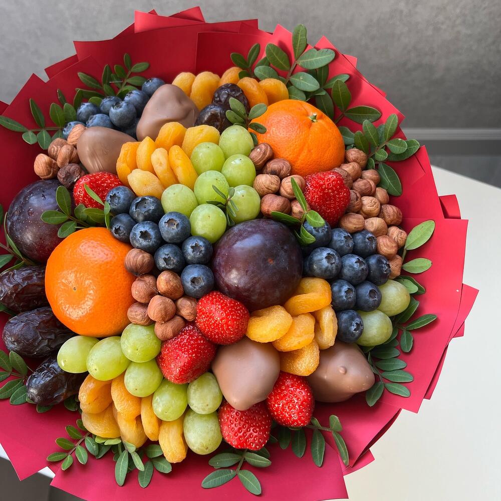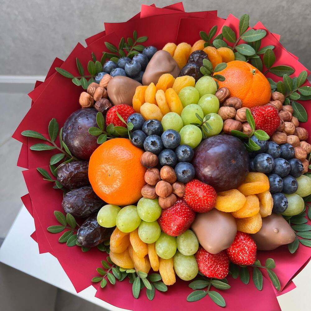 Beautiful and healthy combination of fruits, berries and nuts. A delicious gift for your loved ones!