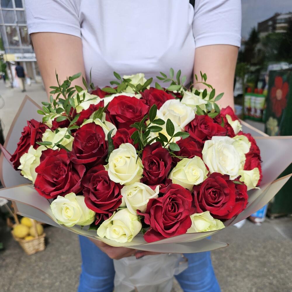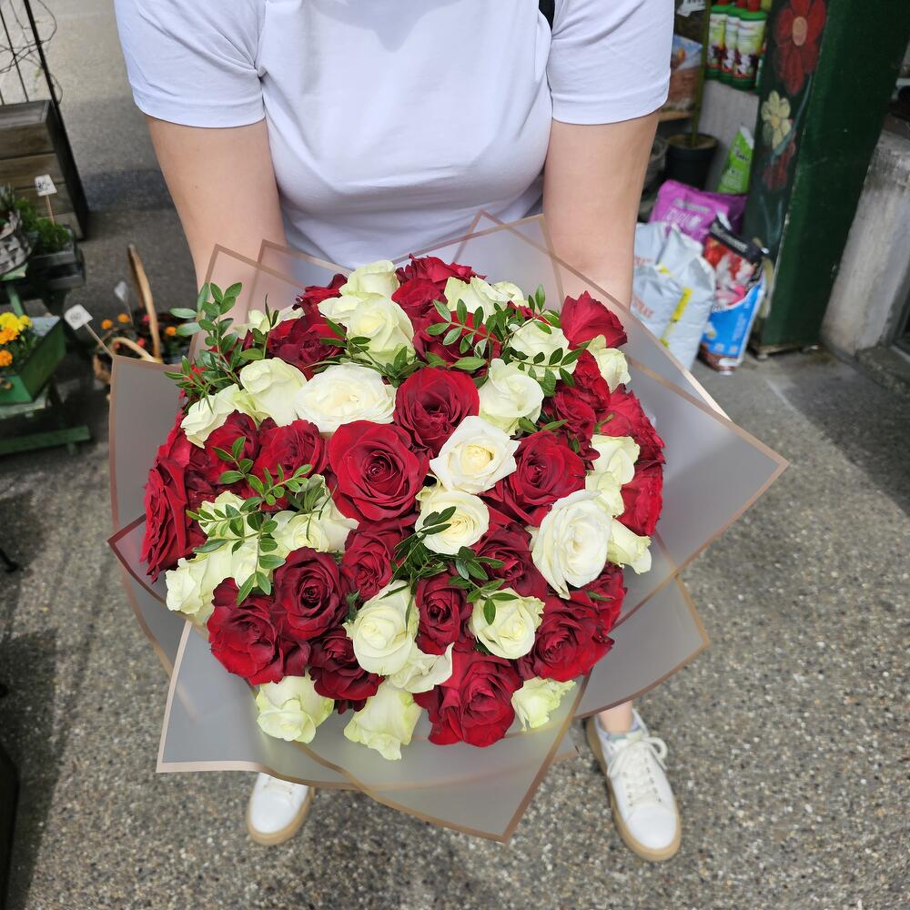 Szatén szalag - 1 db. pistachio leaves - 5 db. roses red and white - 51 db. paper wraping - 1 db.