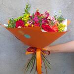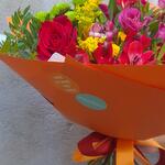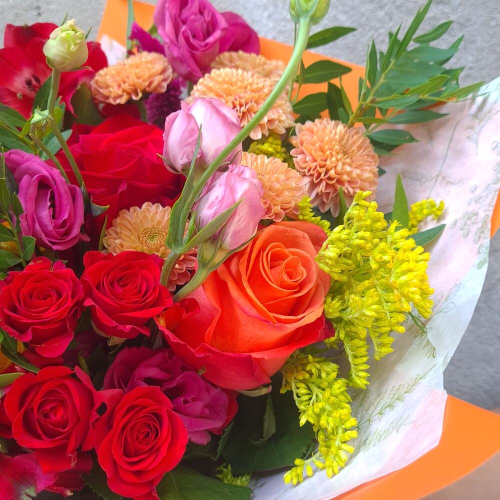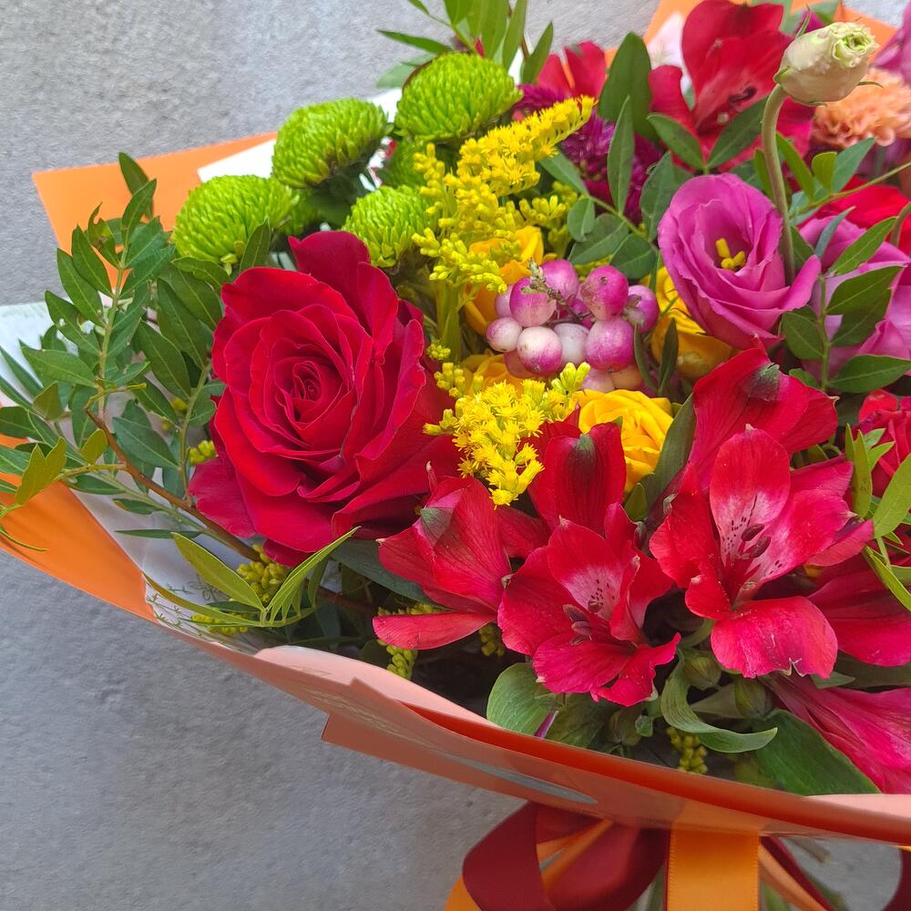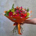 Autumn in Paris – a bright, elegant bouquet in warm autumn shades, wrapped in stylish orange paper with satin ribbons. A mix of fresh roses, spray roses, lisianthus, chrysanthemums and seasonal greenery creates a cozy yet chic Parisian mood. 🍁 Colors: red, orange, yellow, pink – like autumn leaves in the streets of Paris. 🌹 Flowers: roses, spray roses, lisianthus, chrysanthemums, seasonal accents. ✨ Occasion: birthdays, anniversaries, romantic gestures, autumn celebrations, “just because” surprises. This bouquet is a perfect gift for someone special, a stylish centerpiece for a cozy dinner, or a warm seasonal gesture. Handcrafted from fresh farm flowers. Shades and composition may vary slightly, but each bouquet is unique and equally beautiful.