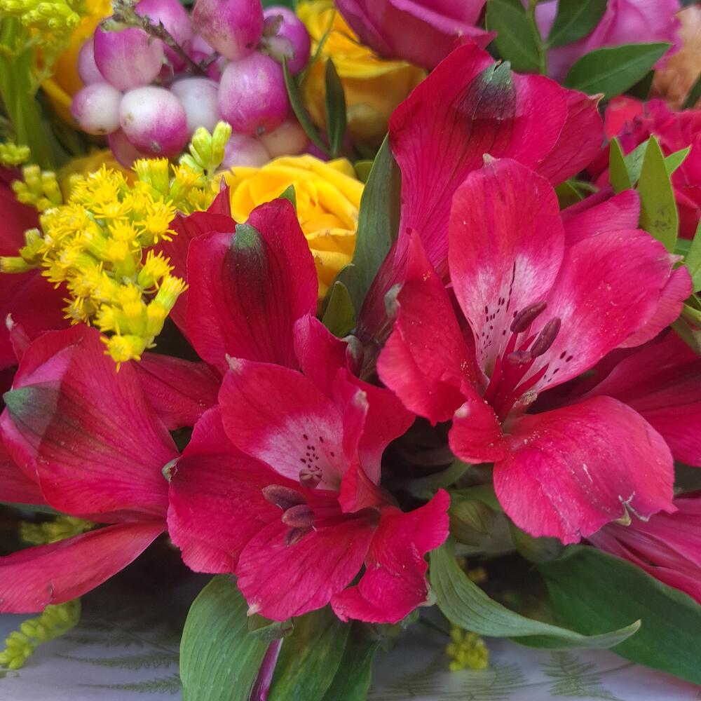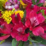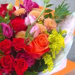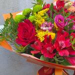 Eustoma - 1 db. Aranyvessző - 3 db. orbáncfű - 1 db. rose mix - 1 db. alstroemeria keverék - 1 db. chrysanthemum mix - 1 db. zöld keverék - 1 db.