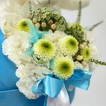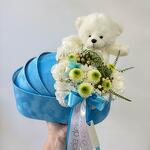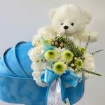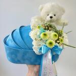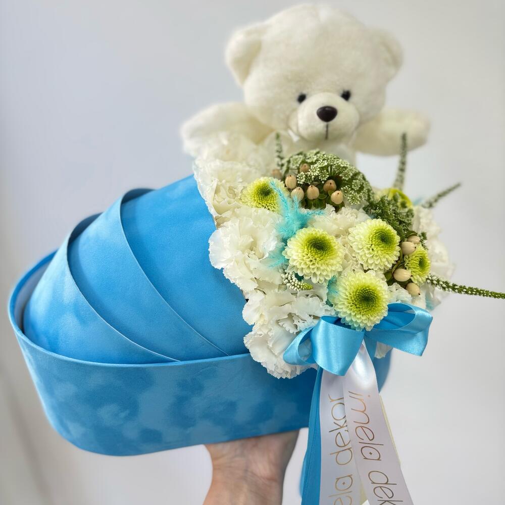 Celebrate the arrival of a newborn with this charming baby shower basket. Fresh white and green flowers are beautifully arranged in a stylish blue wrapping, decorated with a satin ribbon and a soft teddy bear. A thoughtful and heartwarming gift for new parents, perfect for welcoming a baby boy.
