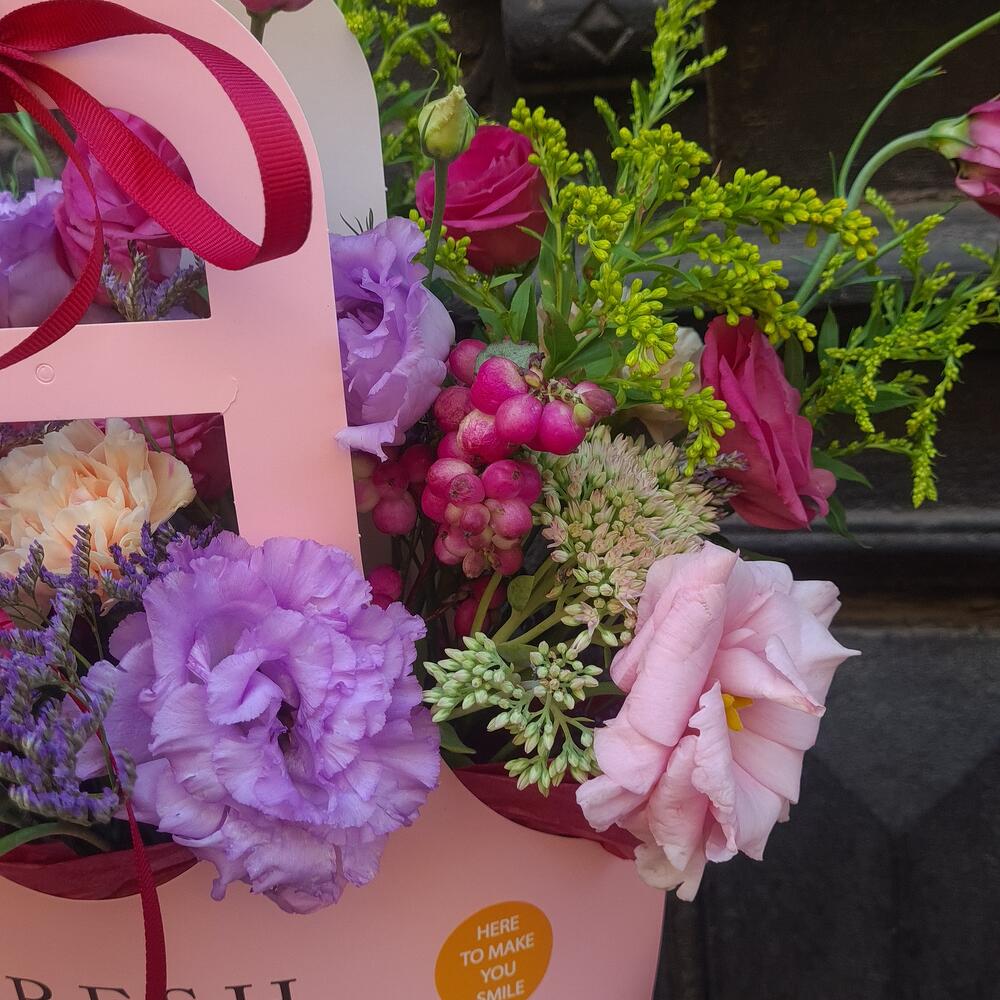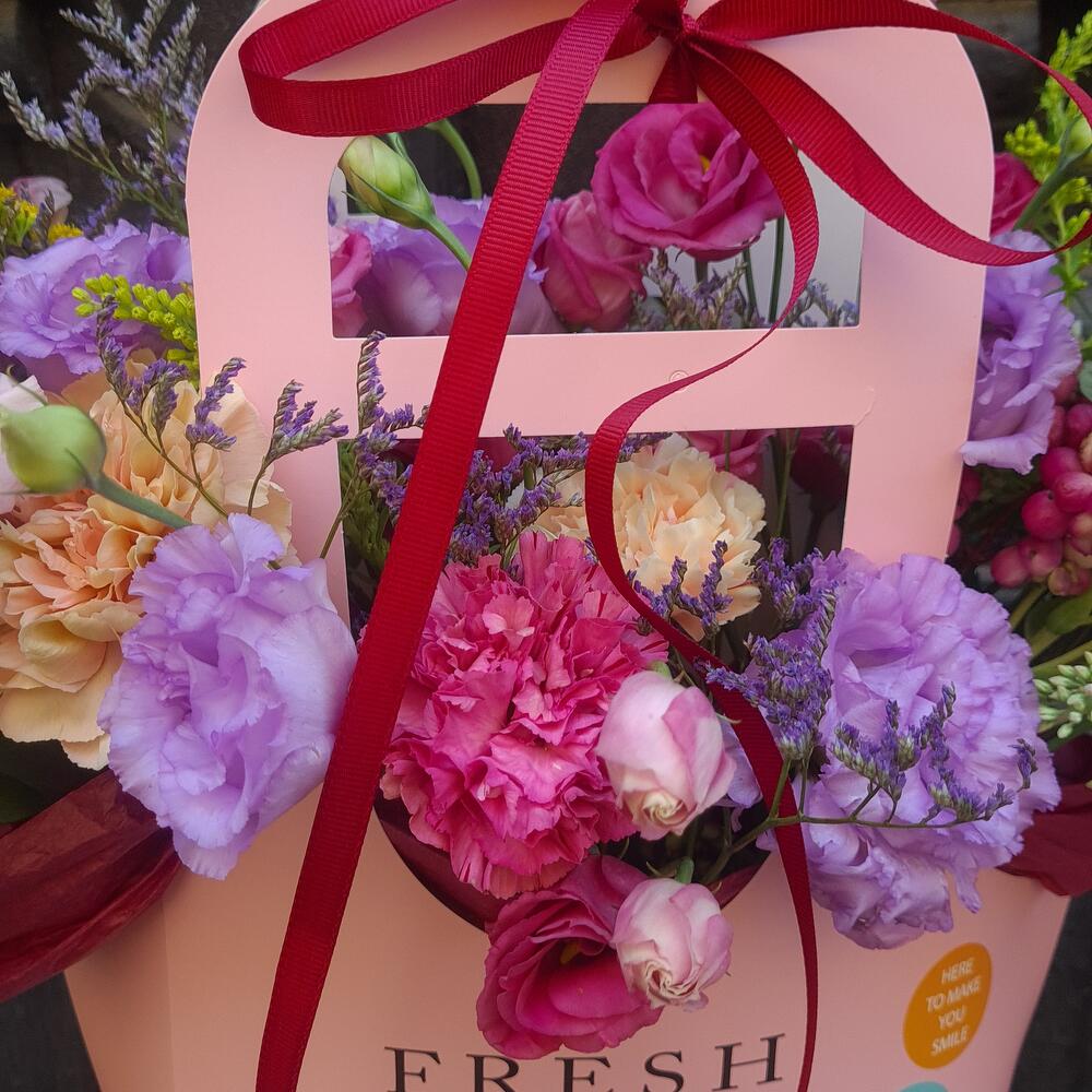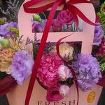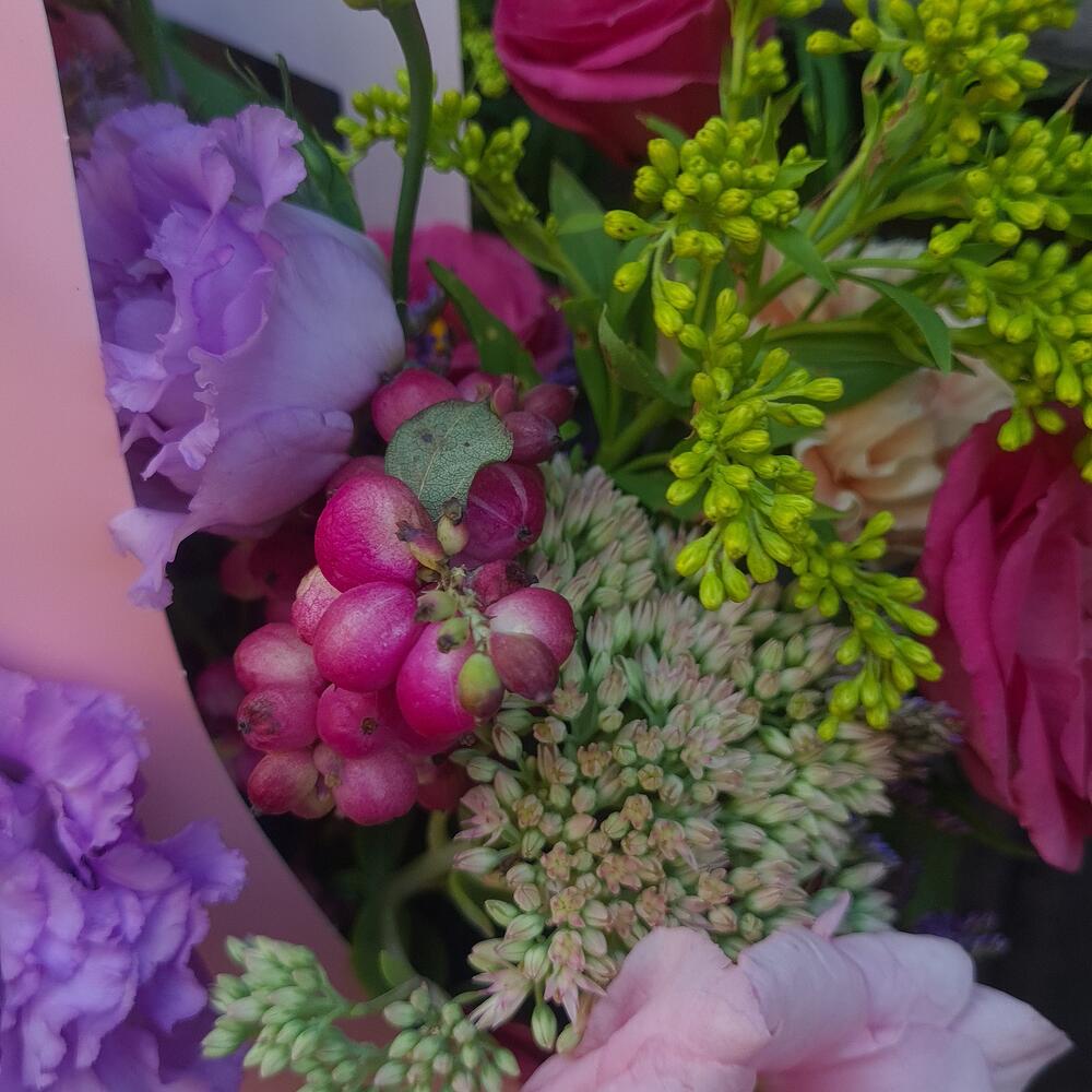 Berry Kiss – stylish flower arrangement in a designer box A delicate mix of fresh roses, lisianthus, carnations, and seasonal flowers in soft pink, purple, and berry shades. This elegant box arrangement is a perfect gift for birthday, anniversary, romantic surprise, or just to make someone smile. Crafted by our florists with premium fresh flowers, arranged in a modern box with ribbon for an extra touch of charm. ✔ Long-lasting freshness ✔ Ready-to-gift designer packaging ✔ Ideal for women, friends, loved ones Order now and let Berry Kiss bring beauty, love, and joy to any occasion.
