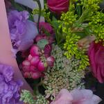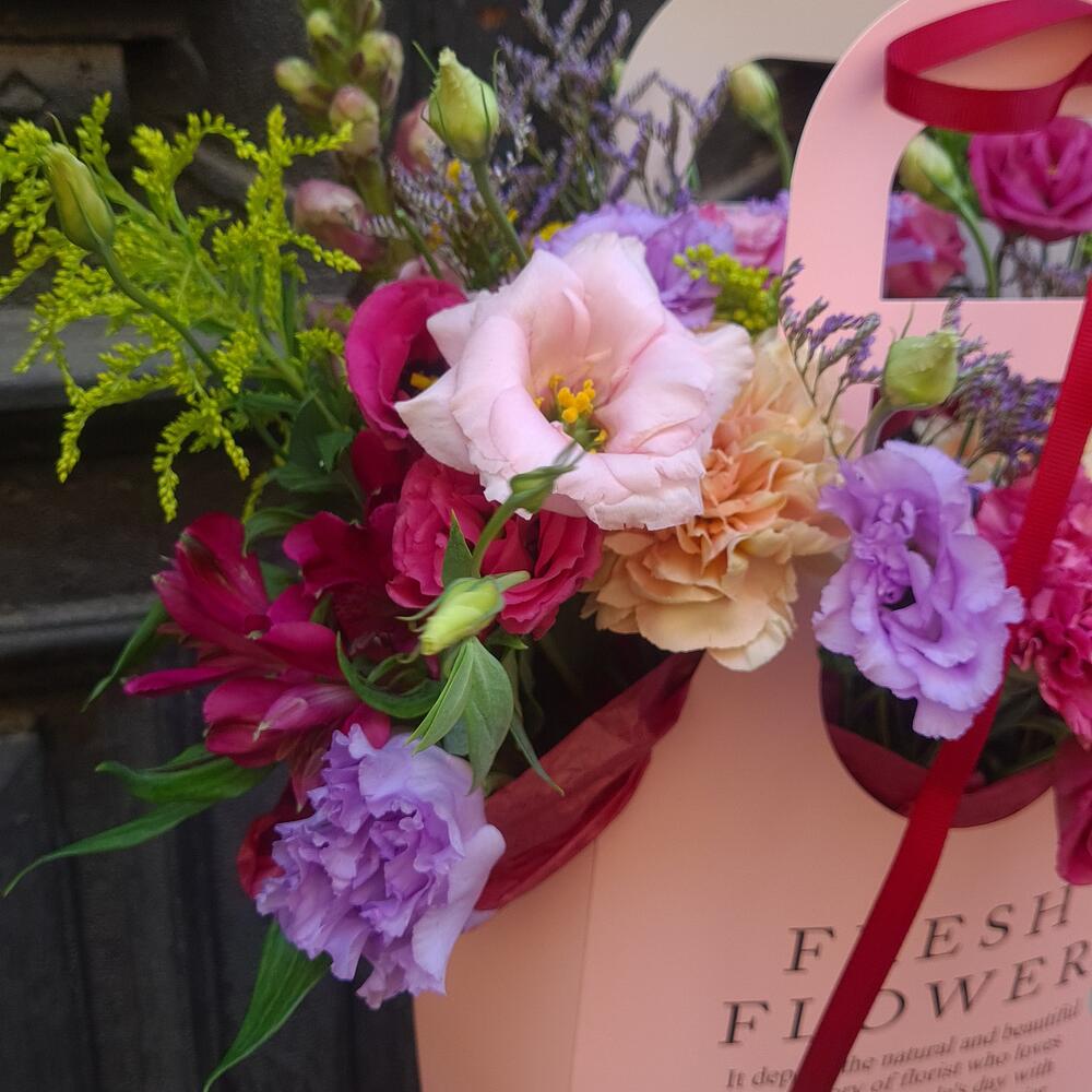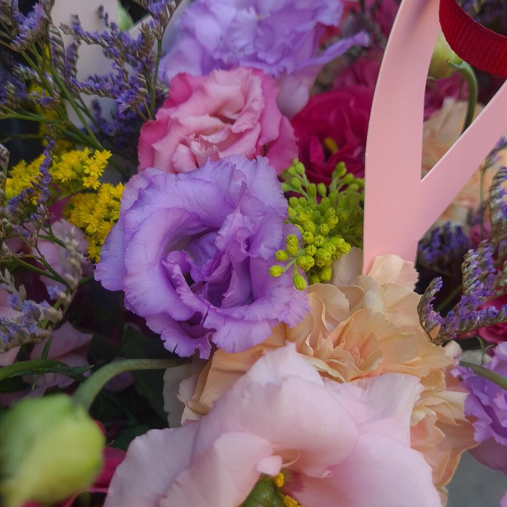 Eustoma - 2 db. Doboz - 1 db. Limonium - 1 db. Aranyvessző - 5 db. Varjúháj - 2 db. Decoration - 1 db. symphoricarpos - 1 db. alstroemeria keverék - 1 db. szegfű mix - 4 db. oroszlánszáj - 1 db.