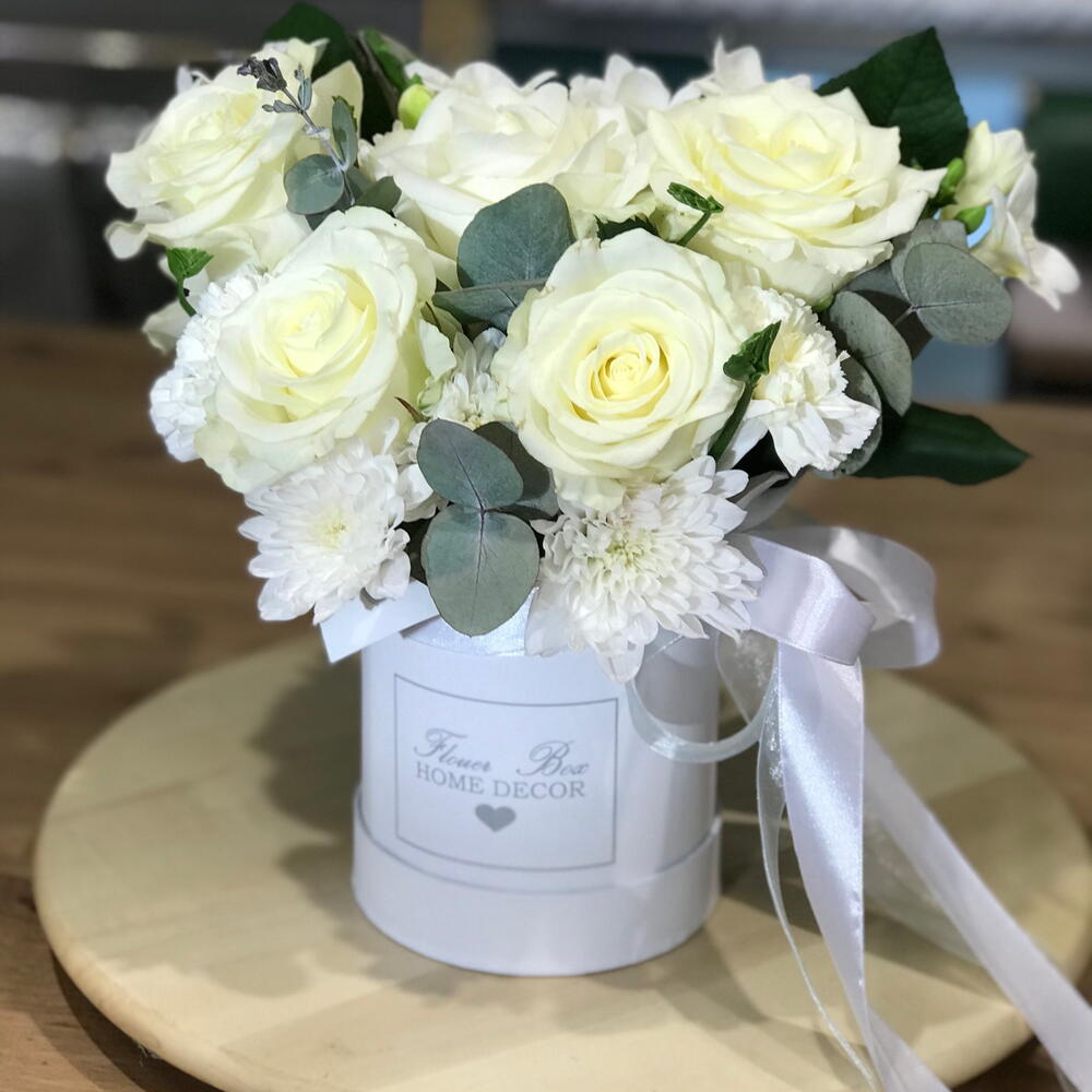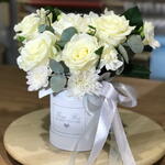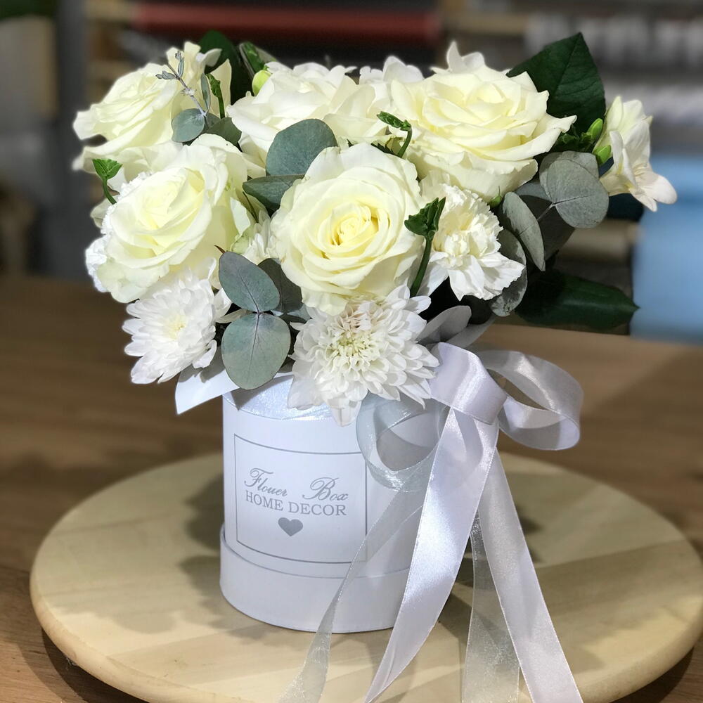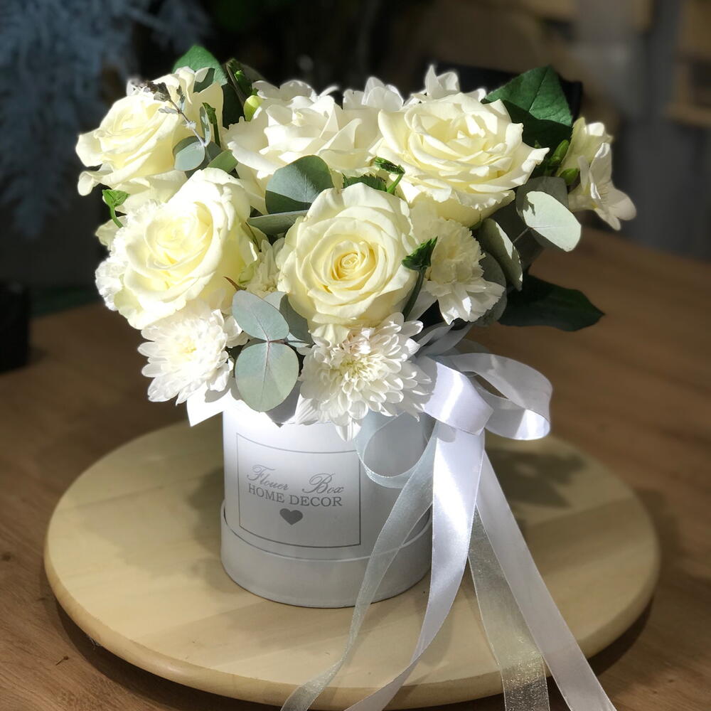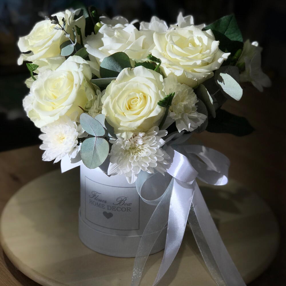 rózsa - 5 db. eukaliptusz - 3 db. szegfű - 2 db. fehér margaréta - 2 db. frézia - 4 db. dísznövényzet - 3 db.