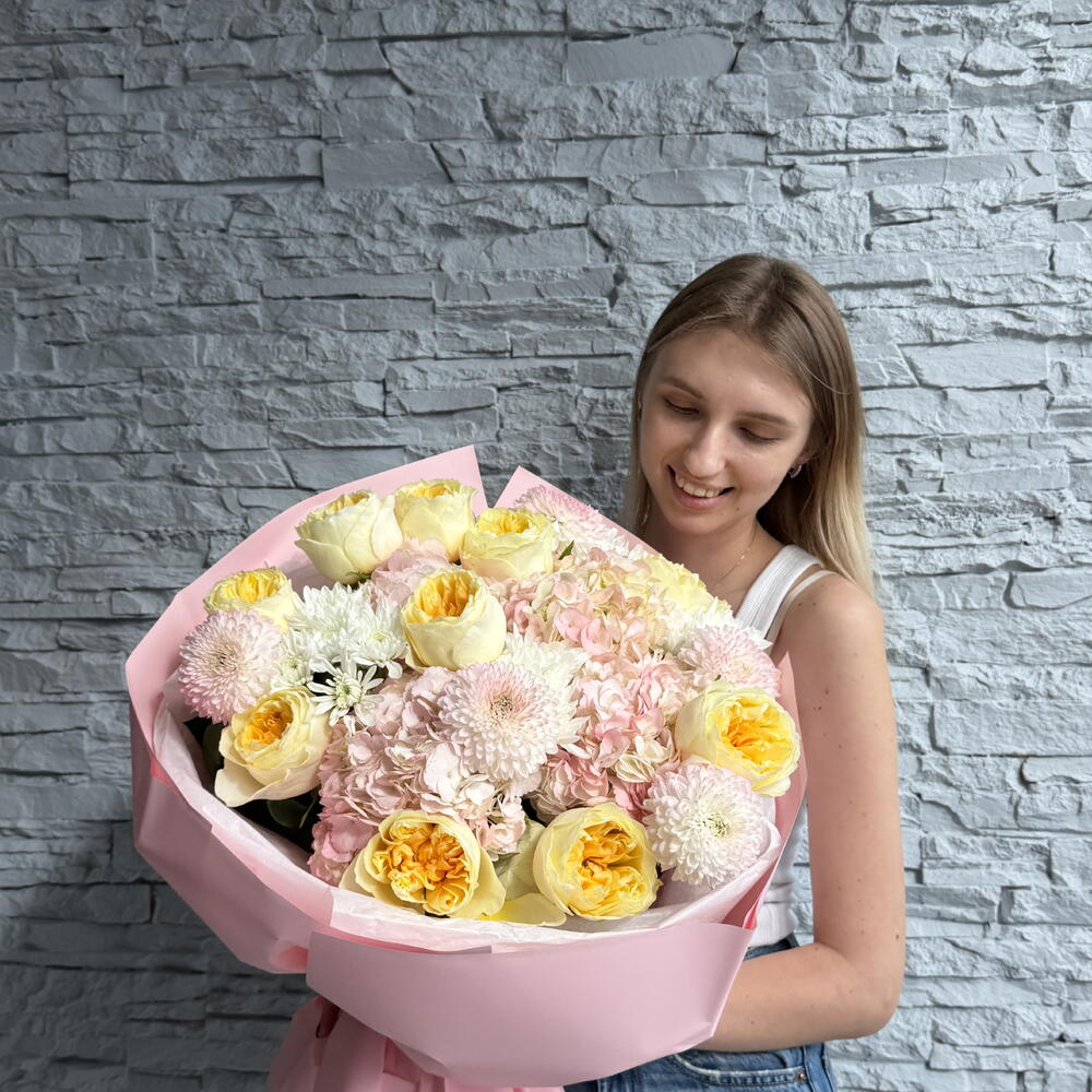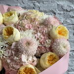Hagyd ámulatba esni valakit ezzel a gyönyörű, látványos csokorral, tele festett hortenzia, kerti rózsa és krizantémokkal! A tökéletes módja annak, hogy szirmokkal suttogd el érzéseidet, és bizonyítsd, hogy szerelemben minél több, annál jobb. Hagyd, hogy ez a dús, jóképű férfi mondja el helyetted mindent — és nézd, ahogy felragyognak a szemük!