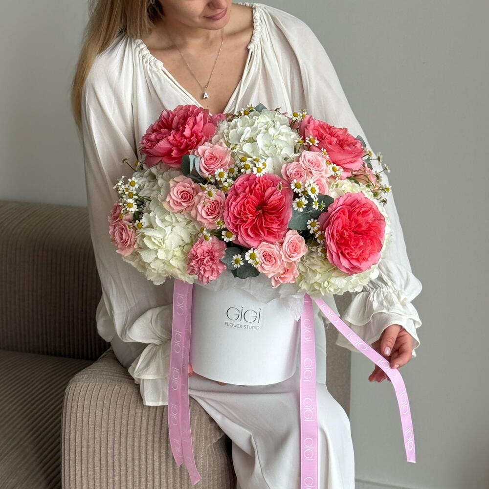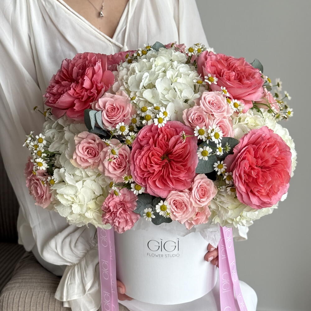 Spray rózsa - 6 db. fehér hortenzia - 5 db. eukaliptusz szárak - 6 db. kamilla tanacetum - 7 db. rózsaszín kifejezésű kerti rózsák - 7 db.
