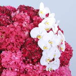Indulge in the blissful beauty of our Blush Crimson Bliss arrangement. This captivating combination of red and pink hydrangeas and elegant phalaenopsis orchids is beautifully arranged in a chic box. It is perfect for adding a touch of vibrant elegance to any celebration or as a special gift.