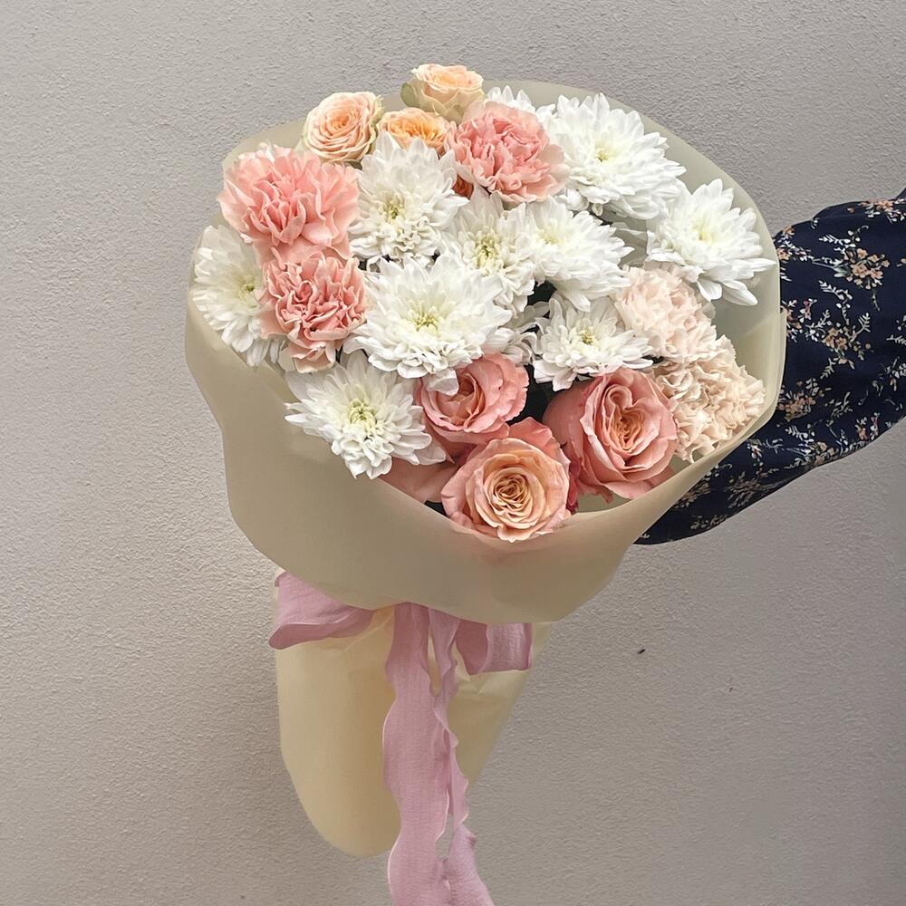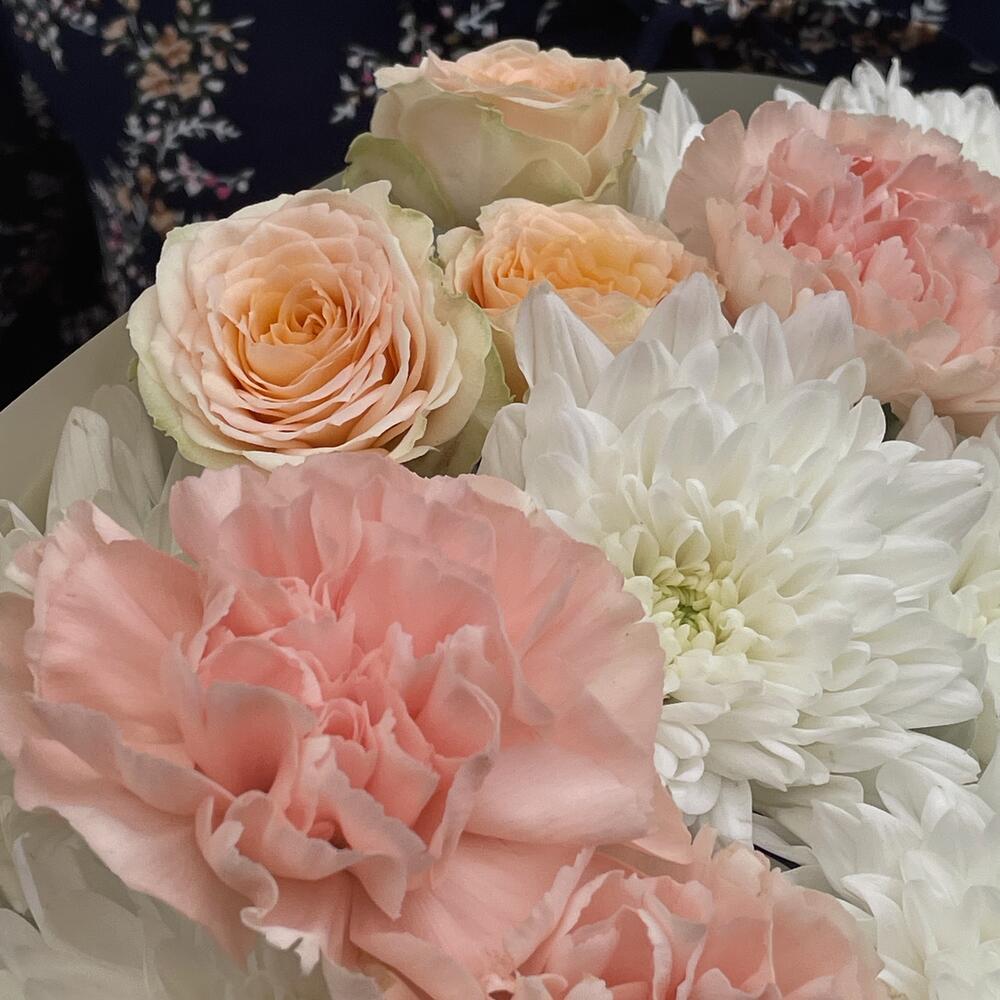 Mini rose - 1 db. rózsaszín - 3 db. szegfű - 5 db. krizantém - 2 db.