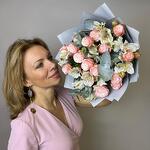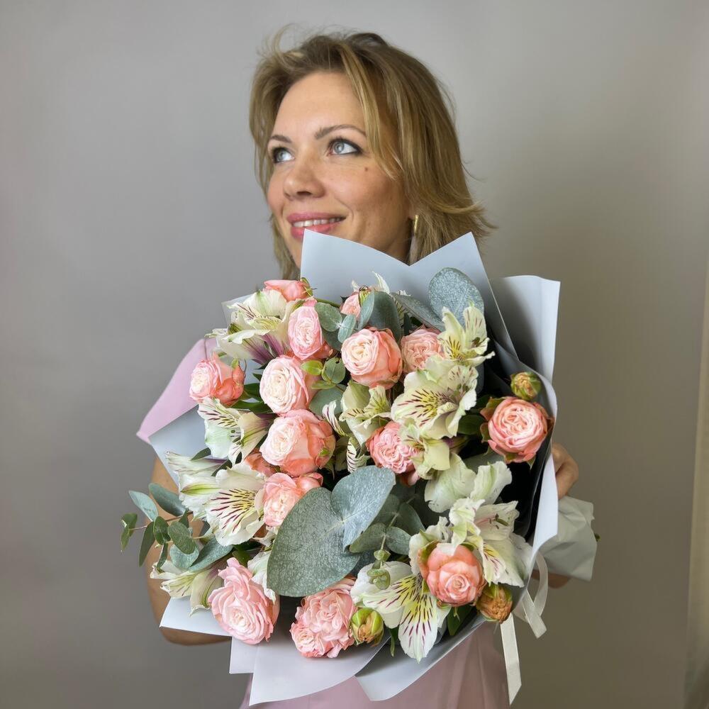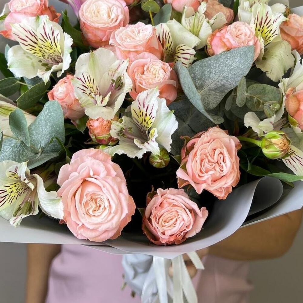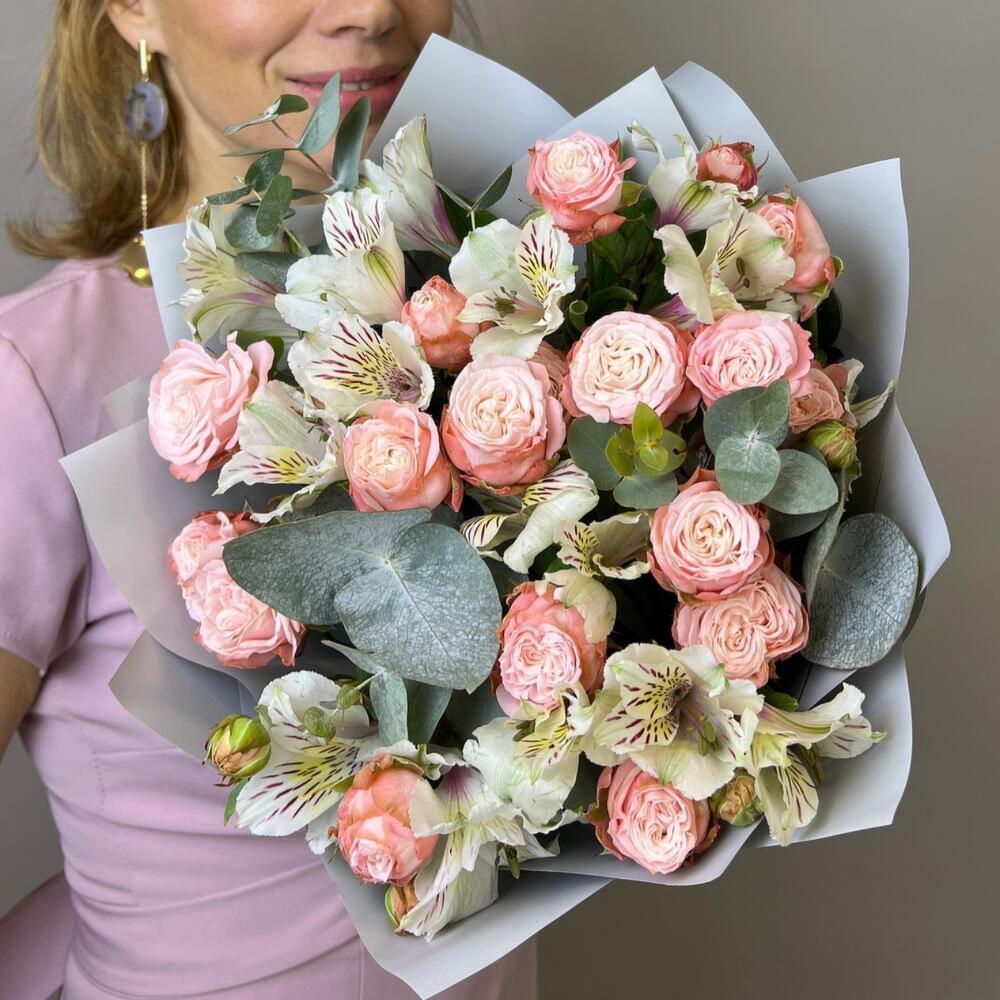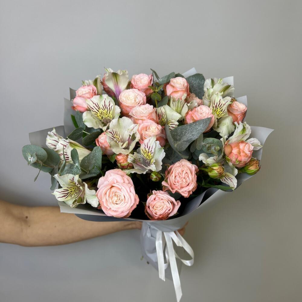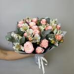 Букет Пастель : Кустовые пионовидные розы с альстромерией