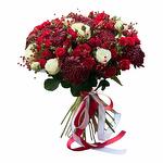Красивый букет с красными кустовыми розами, хризантемой, и белыми розами подарить незабиваемые эмоции получателю