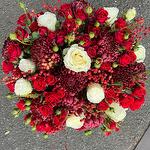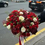 Букет с красными кустовыми розами, хризантемой, и белыми розами