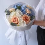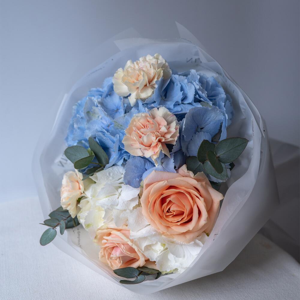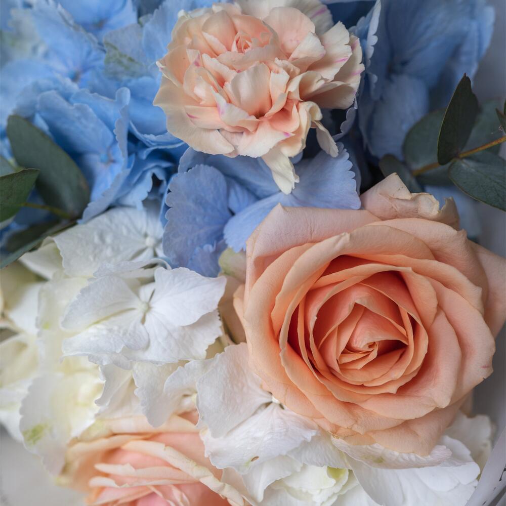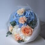 kék hortenzia - 1 db. eucalyptus cinerea - 1 db. rose (peach) - 2 db. carnation kr. - 3 db. hydrangea white (l.l.) - 1 db.
