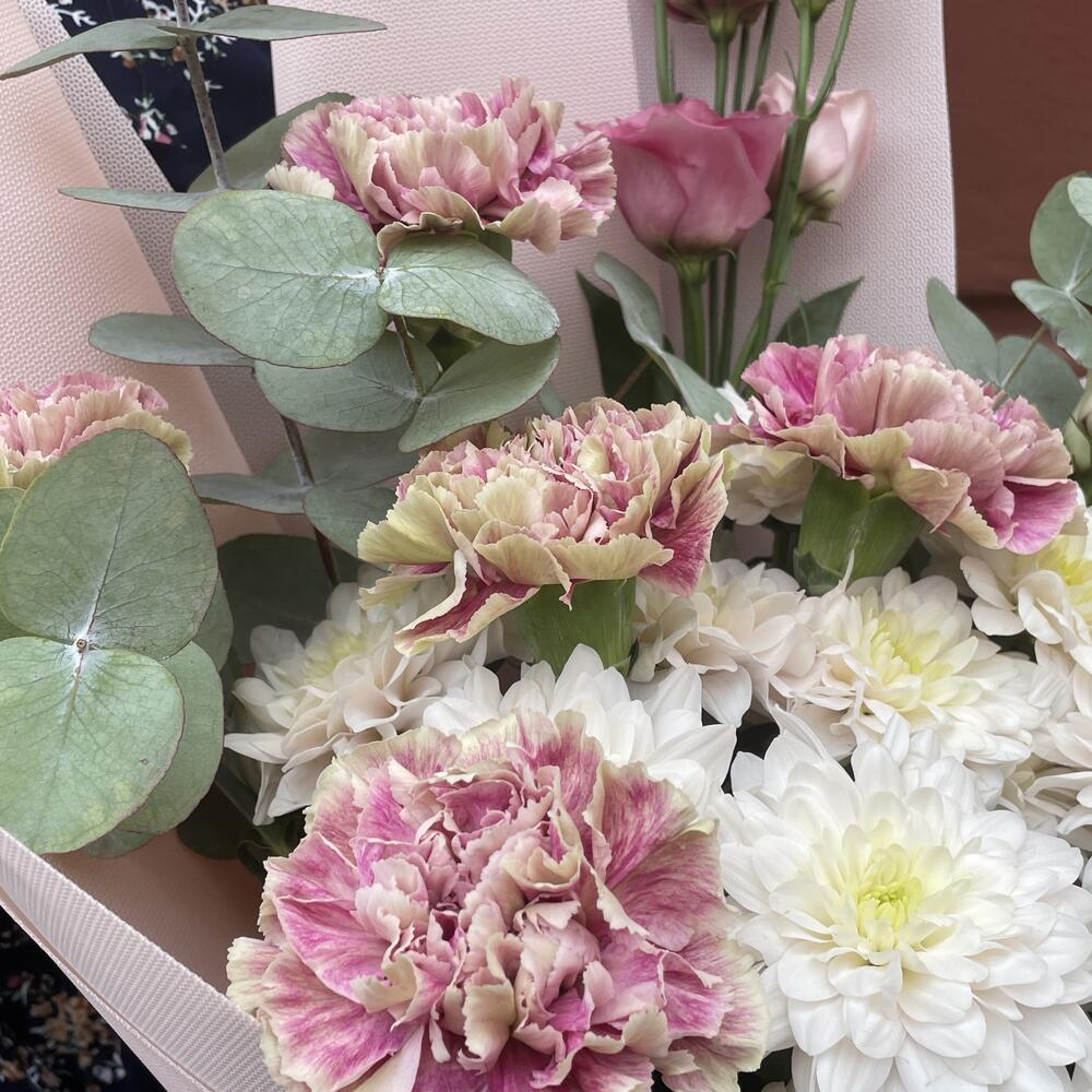 eukaliptusz - 1 db. szegfű - 5 db. liziantusz - 3 db. krizantém - 3 db.