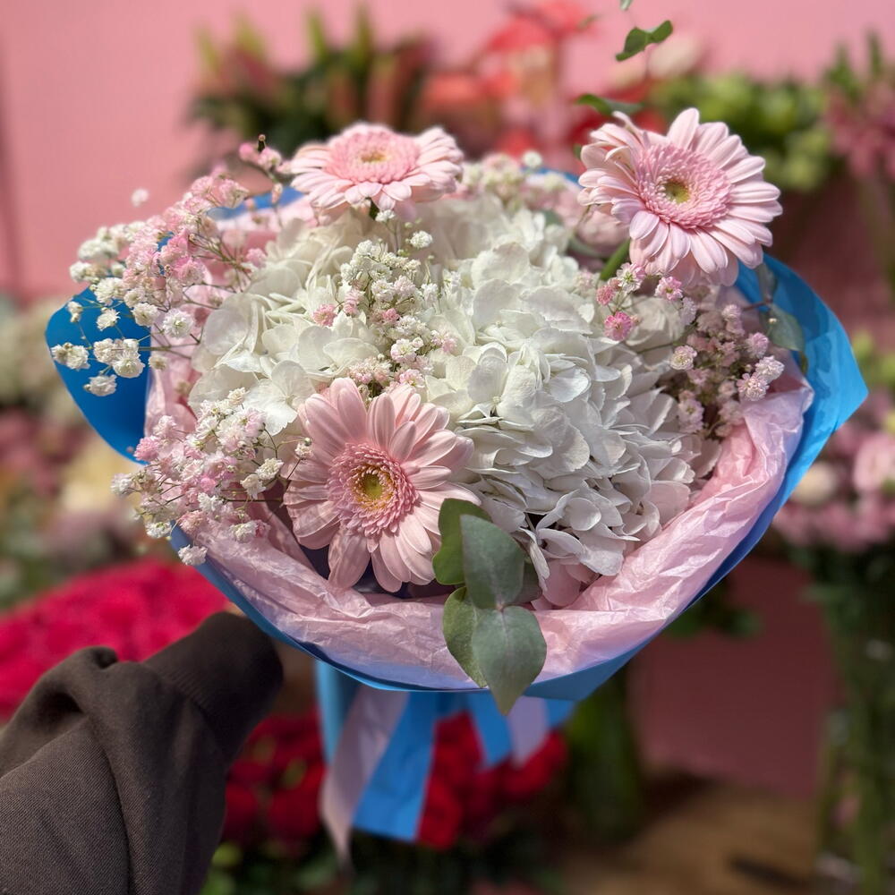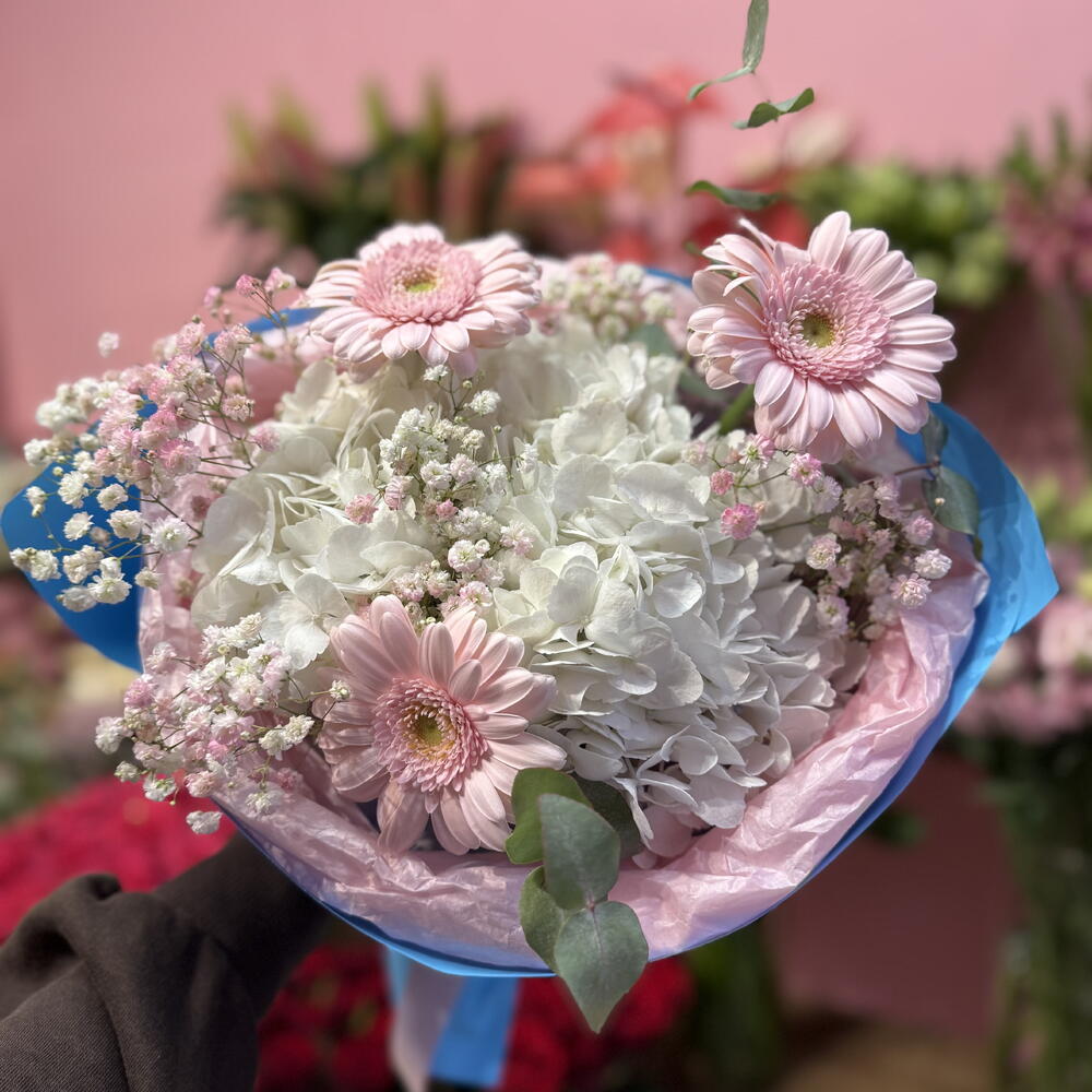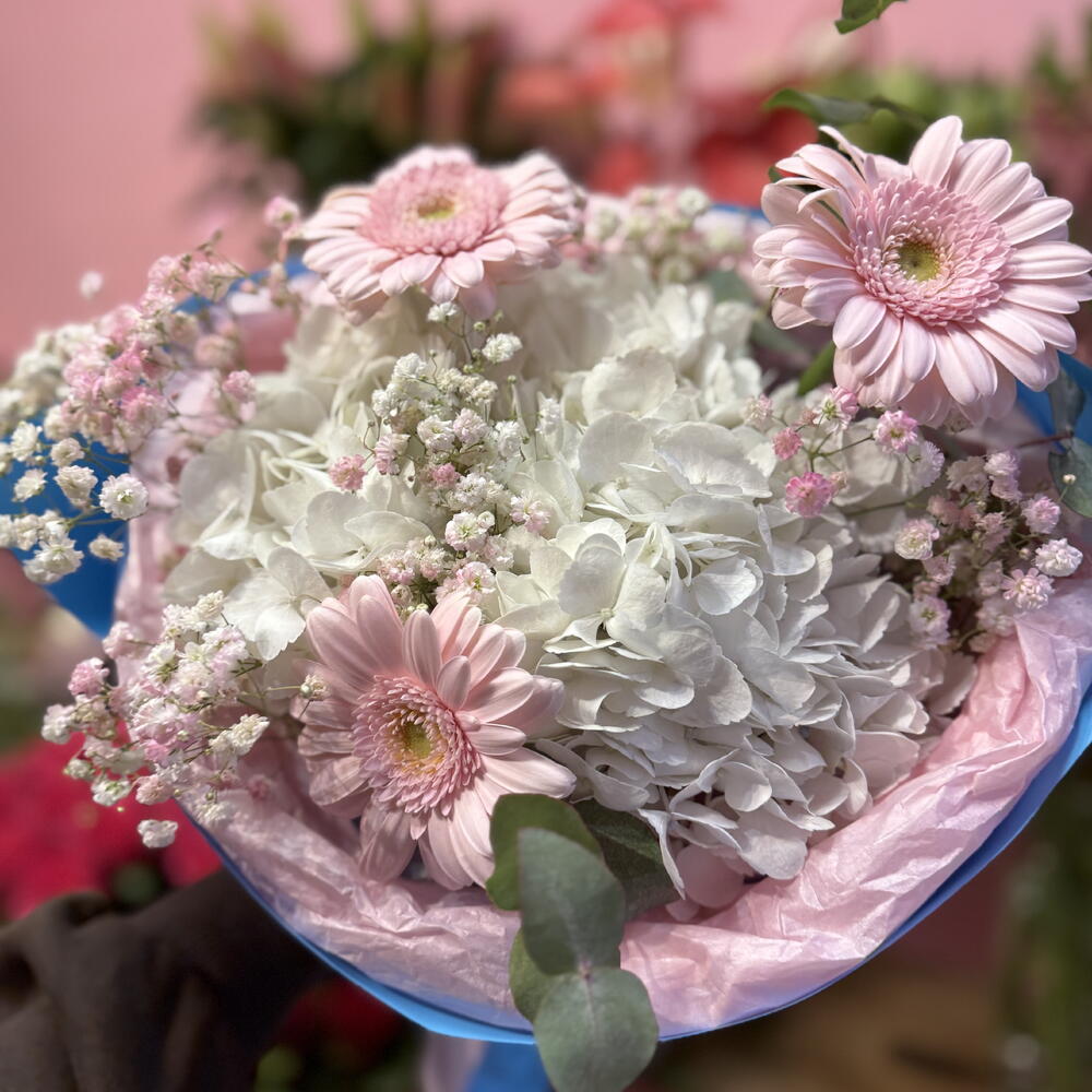 Delikatny i pełen uroku bukiet, w którym spotykają się elegancja i świeżość natury. Jasne odcienie gerber i hortensji harmonijnie łączą się z subtelną bielą gipsówki, tworząc kompozycję o lekkim, romantycznym charakterze. Całość została otulona błękitnym opakowaniem, które dodaje bukietowi świeżości i podkreśla jego wiosenny, radosny nastrój. Ten bukiet to doskonały wybór na każdą okazję – od urodzin, przez podziękowania, aż po wyraz sympatii czy delikatny gest wdzięczności.