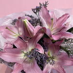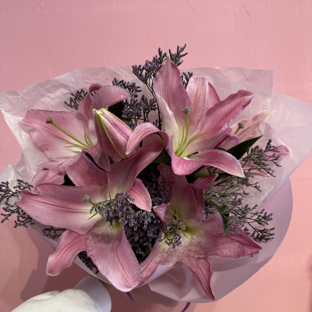 Elegancki i subtelny bukiet, w którym majestatyczne lilie spotykają się z drobnym, romantycznym limonium. Połączenie tych kwiatów tworzy harmonijną kompozycję o lekkim, świeżym charakterze i delikatnym zapachu. Lilie nadają bukietowi klasy i wdzięku, a limonium dodaje mu lekkości i naturalnego uroku. To idealny wybór dla osób ceniących połączenie elegancji i prostoty – doskonały na wyjątkowe okazje, jak i jako gest wdzięczności czy uznania.