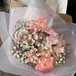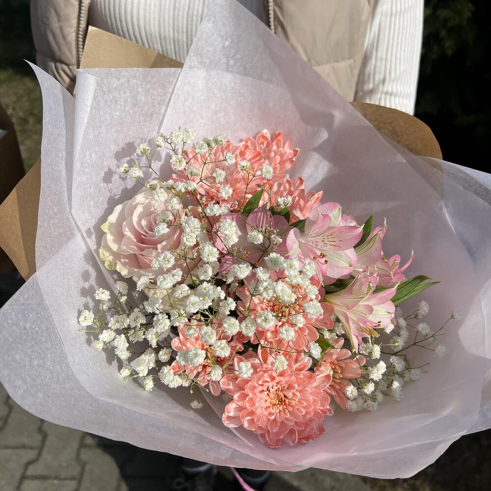 Krizantém - 1 db. Alstroemeria - 1 db. gypsophila - 1 db. rózsaszín rózsa - 1 db. dezertálás - 3 db. selyempapír - 2 db. kraftpapír - 1 db.