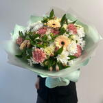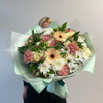 Gerbera - 4 db. alstroemeria keverék - 7 db. rózsa - 7 db. spray rózsa - 7 db. szegfű - 7 db. fehér krizantém - 7 db.