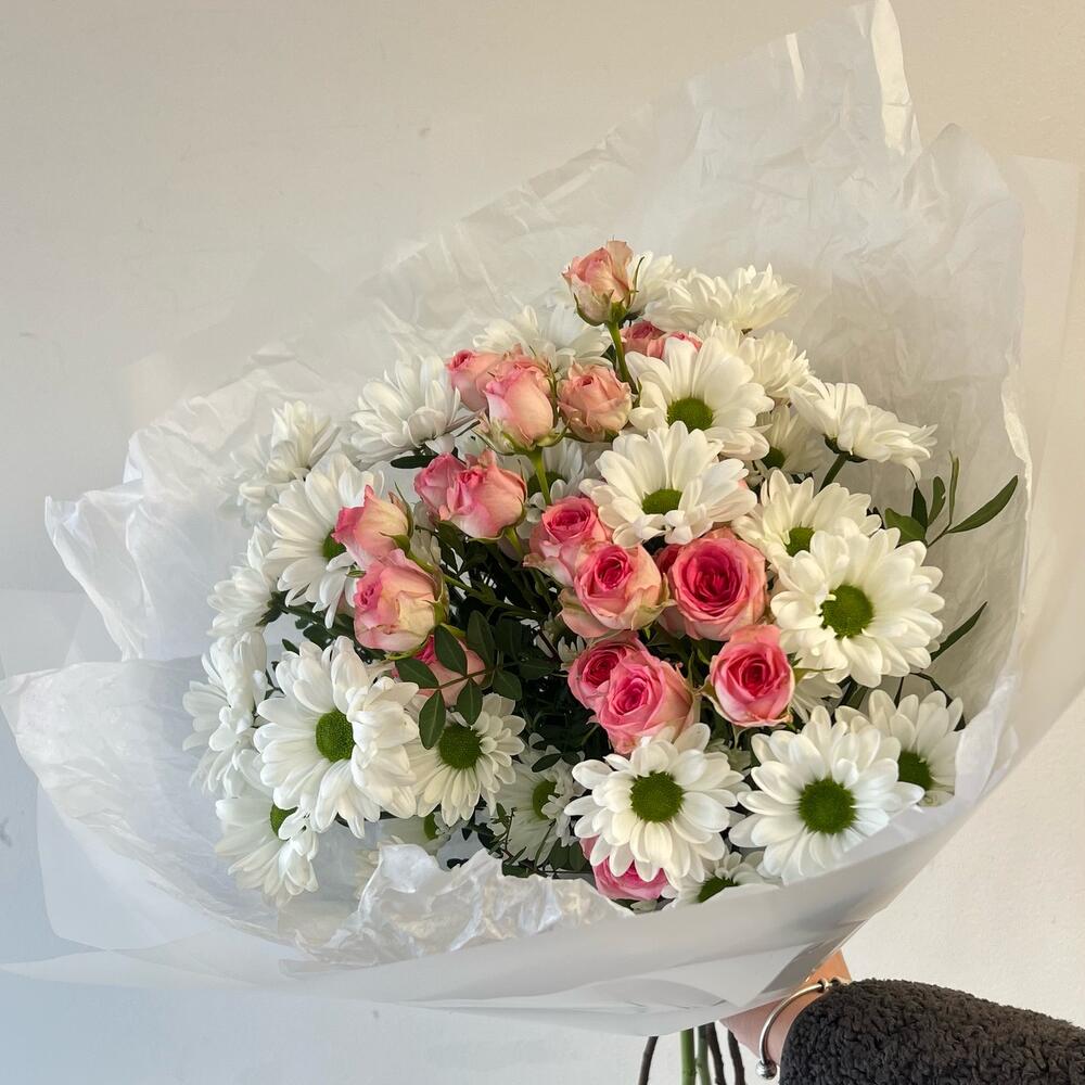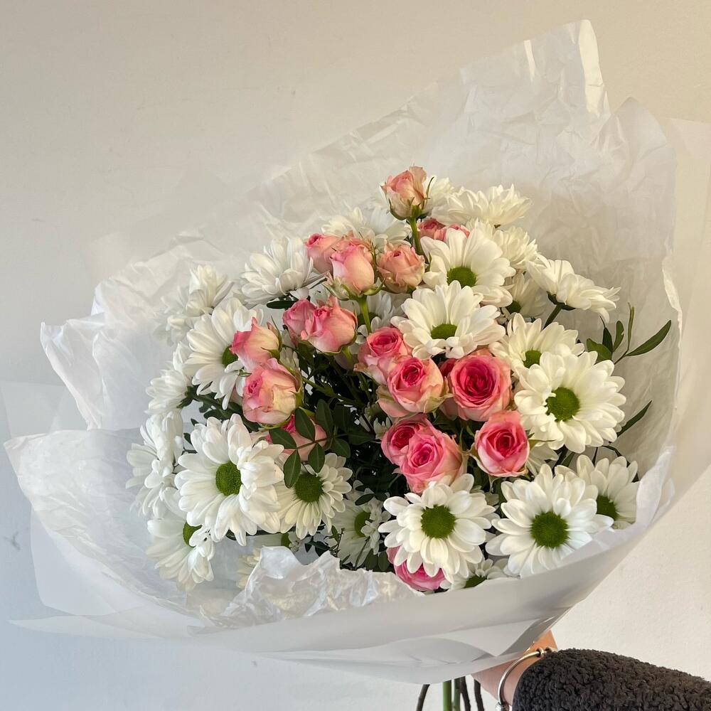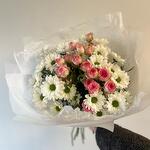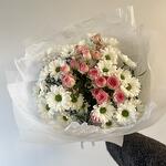 spray rózsa - 3 db. fehér krizantém - 4 db.
