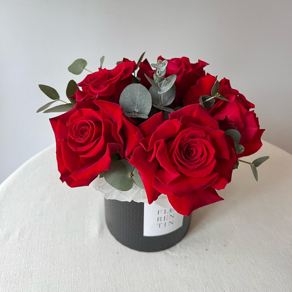 Piros rózsa - 5 db. eukaliptusz - 1 db. hat box - 1 db.