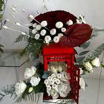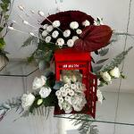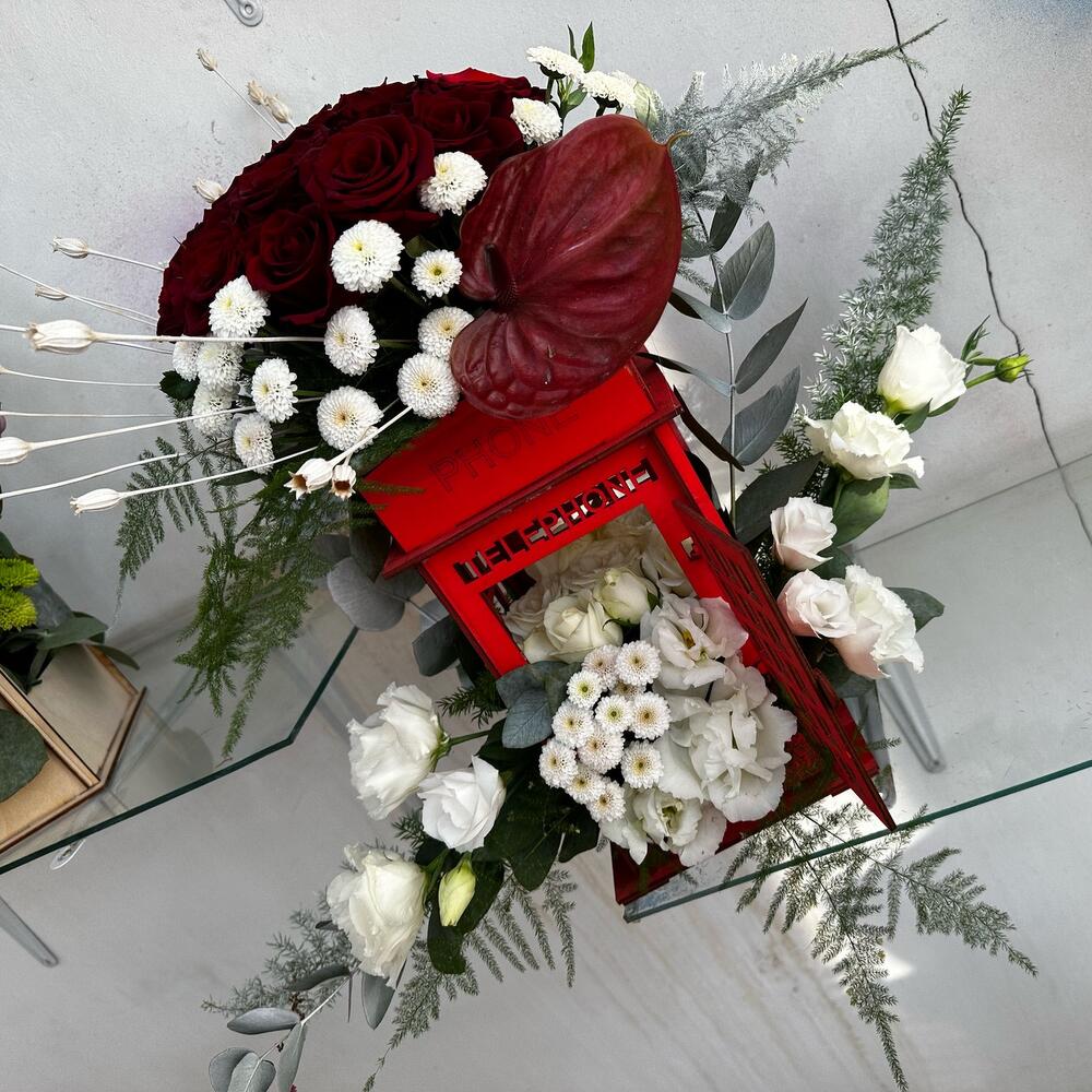 Калла - 1 db. Krizantém bokor - 4 db. Лизиантус Алиса Белый - 5 db. коробка декоративная - 1 db. зелень декоративная - 5 db. rózsák - 11 db.