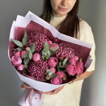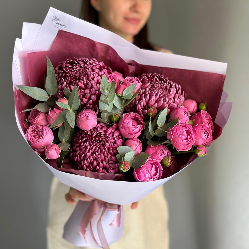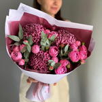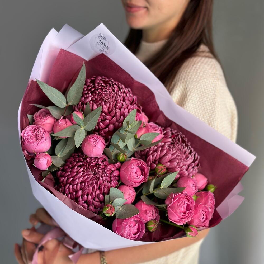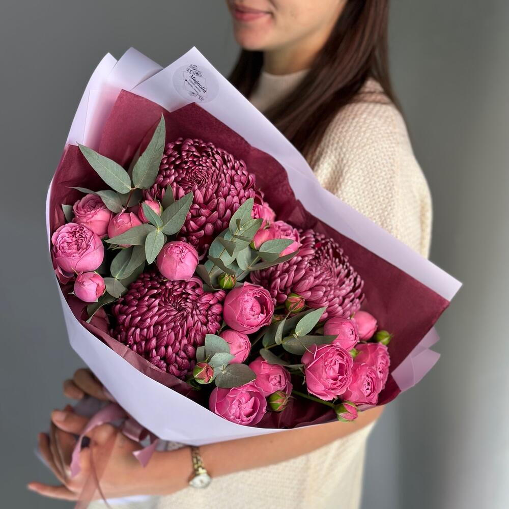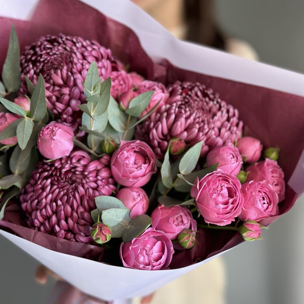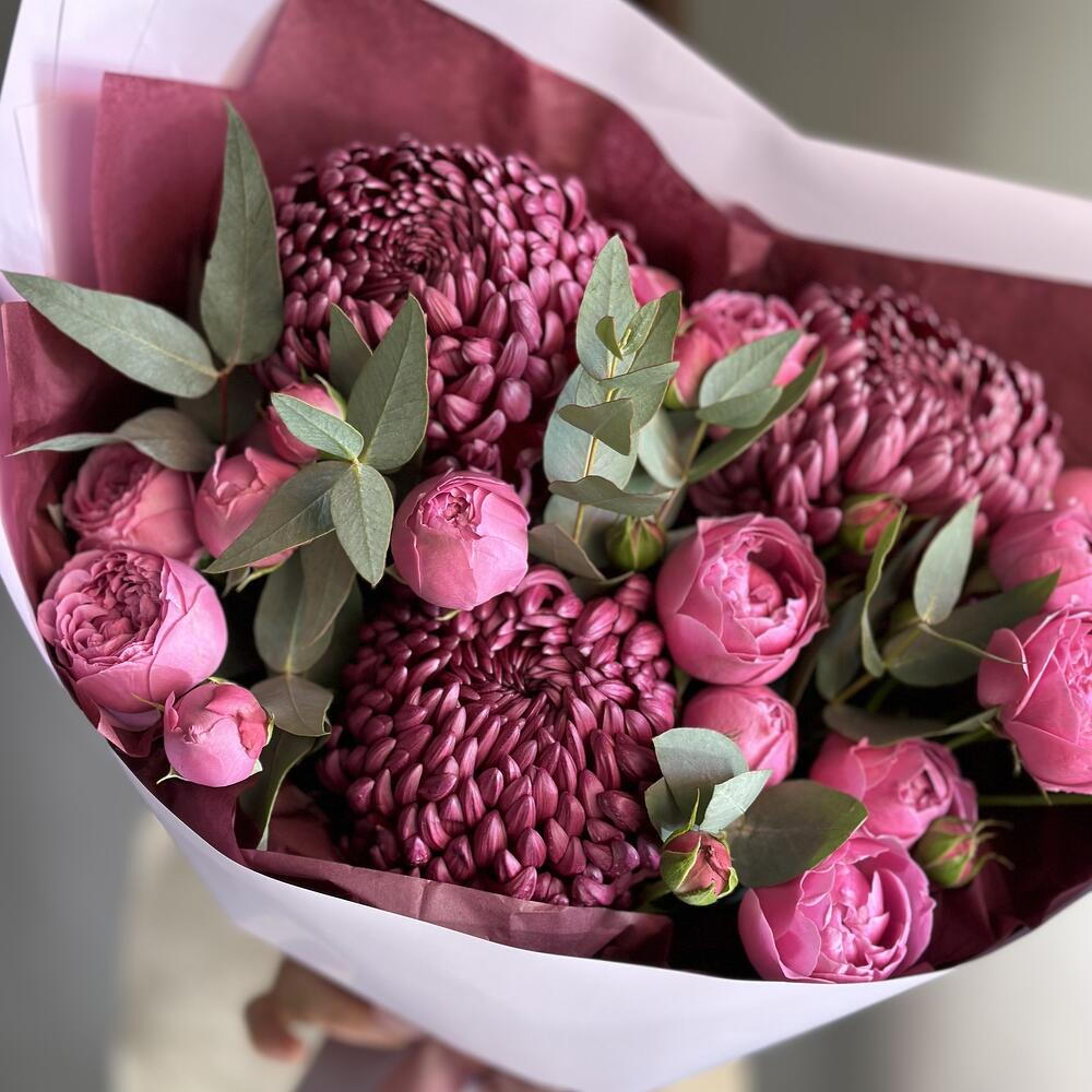 ДЛЯ ЛЮБИМОЙ букет пионовидные кустовые розы, хризантема Бигуди и эвкалипт