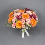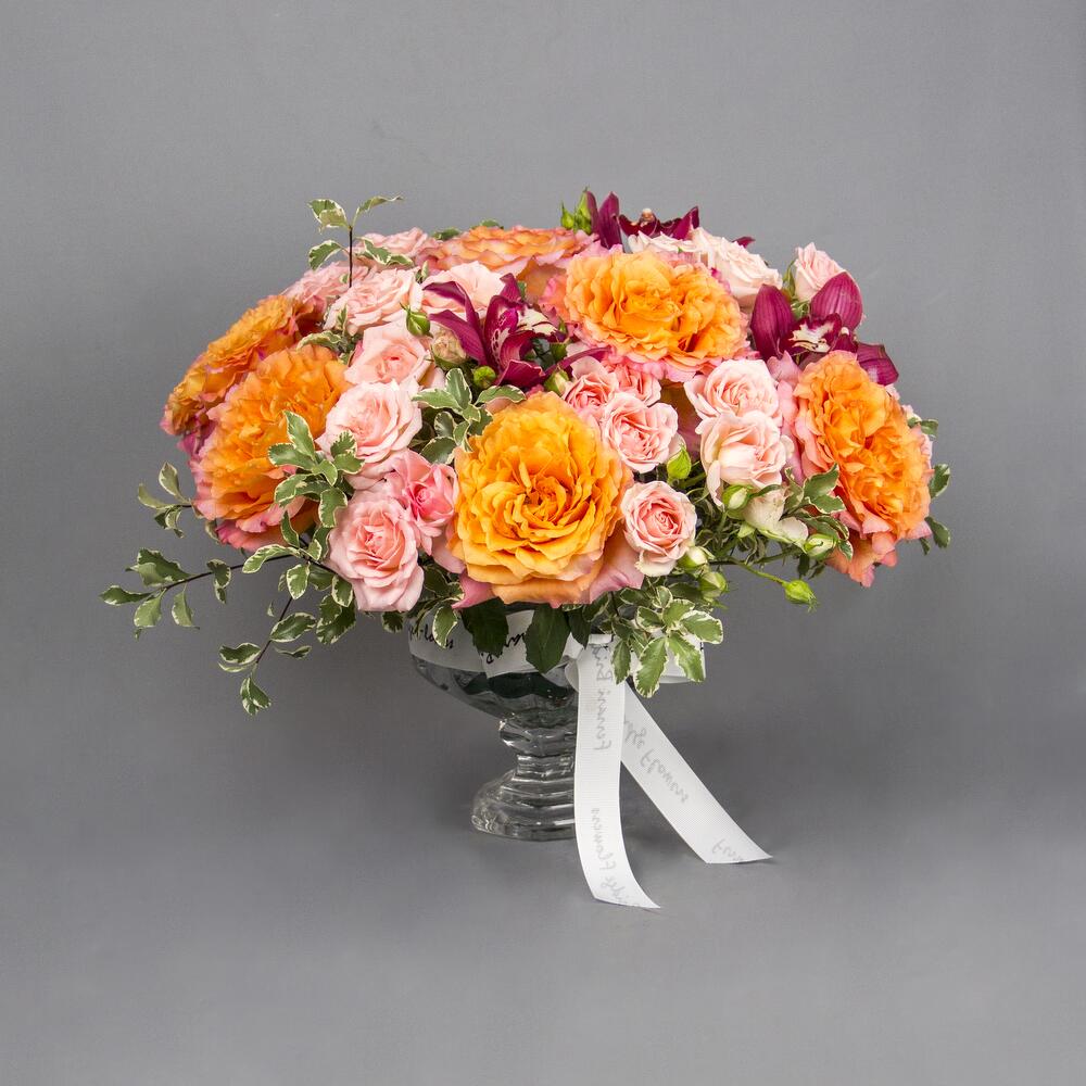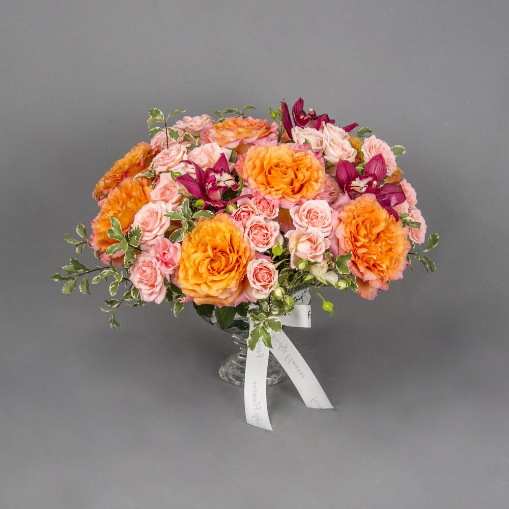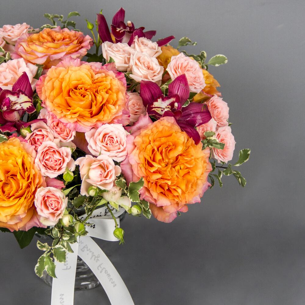 A glass vase arrangement of orange roses, peach spray roses and pink cymbidium orchids