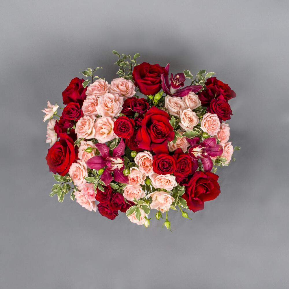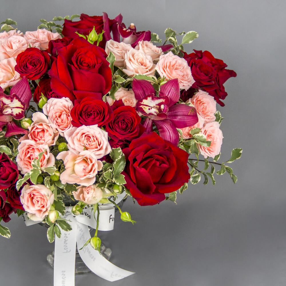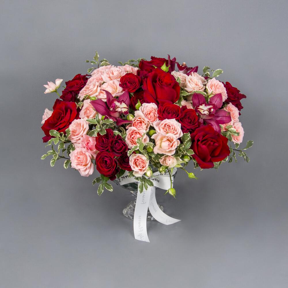 A glass vase arrangement of roses, spray roses, cymbidium orchids and some greenery