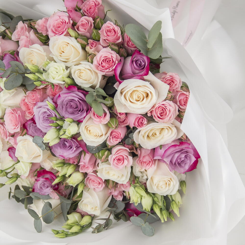 A hand bouquet of purple roses, white roses, pink spray roses, white eustoma and eucalyptus leaves