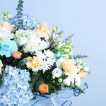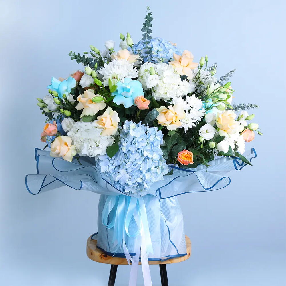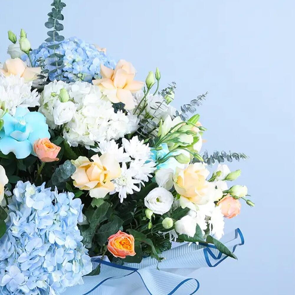 eukaliptusz - 10 db. Krizantém - 10 db. Lisianthus - 20 db. kék rózsa - 10 db. peach rose - 10 db. kék hortenzia - 5 db.