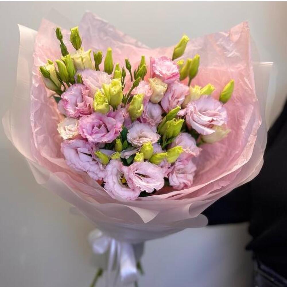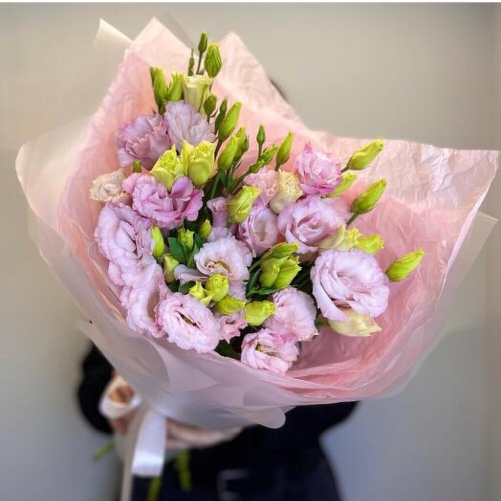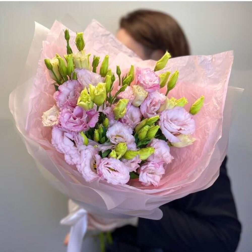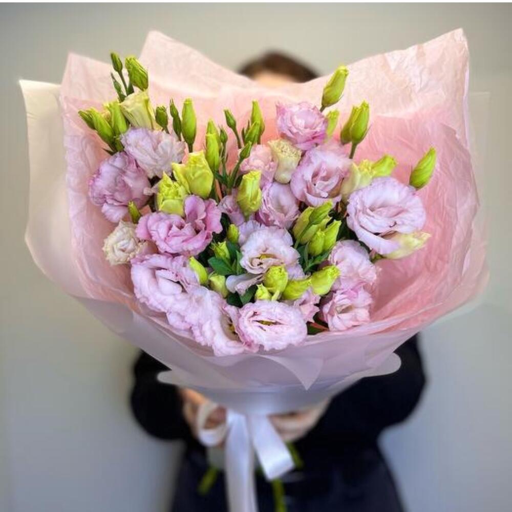 Атласная лента - 1 db. Лизиантус махровый розовый - 5 db. Дизайнерская упаковка - 3 db.