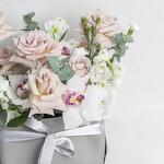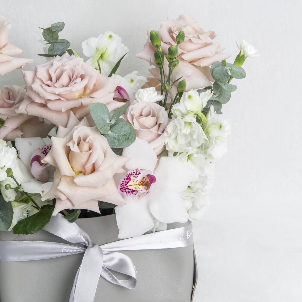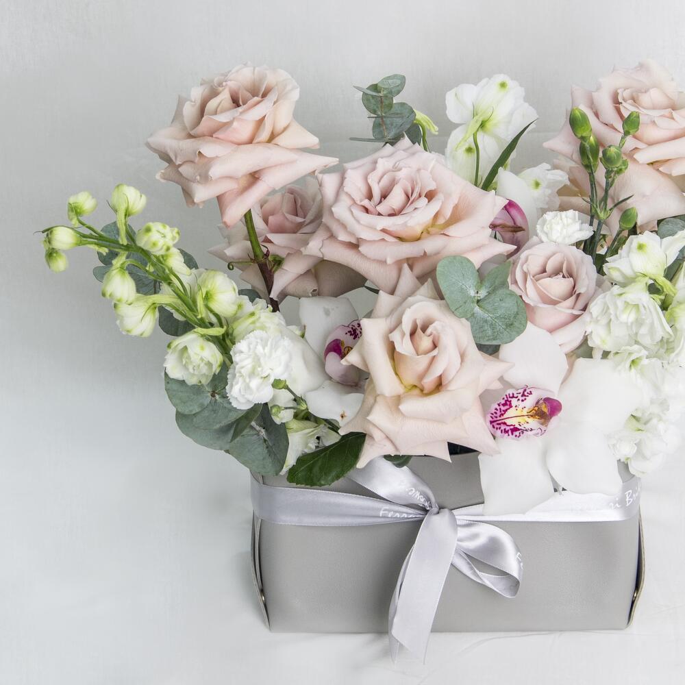 A grey bag arrangement of mix flowers