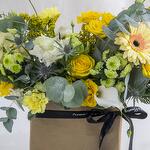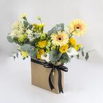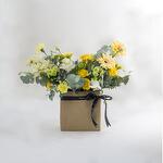 Szalag - 1 db. Eustoma - 3 db. eukaliptusz - 2 db. Eringium - 1 db. Krizantém - 3 db. Gerbera - 2 db. szegfű - 3 db. floral foam - 2 db. calla lily - 2 db. sárga rózsa - 1 db. baby rose yellow - 3 db.