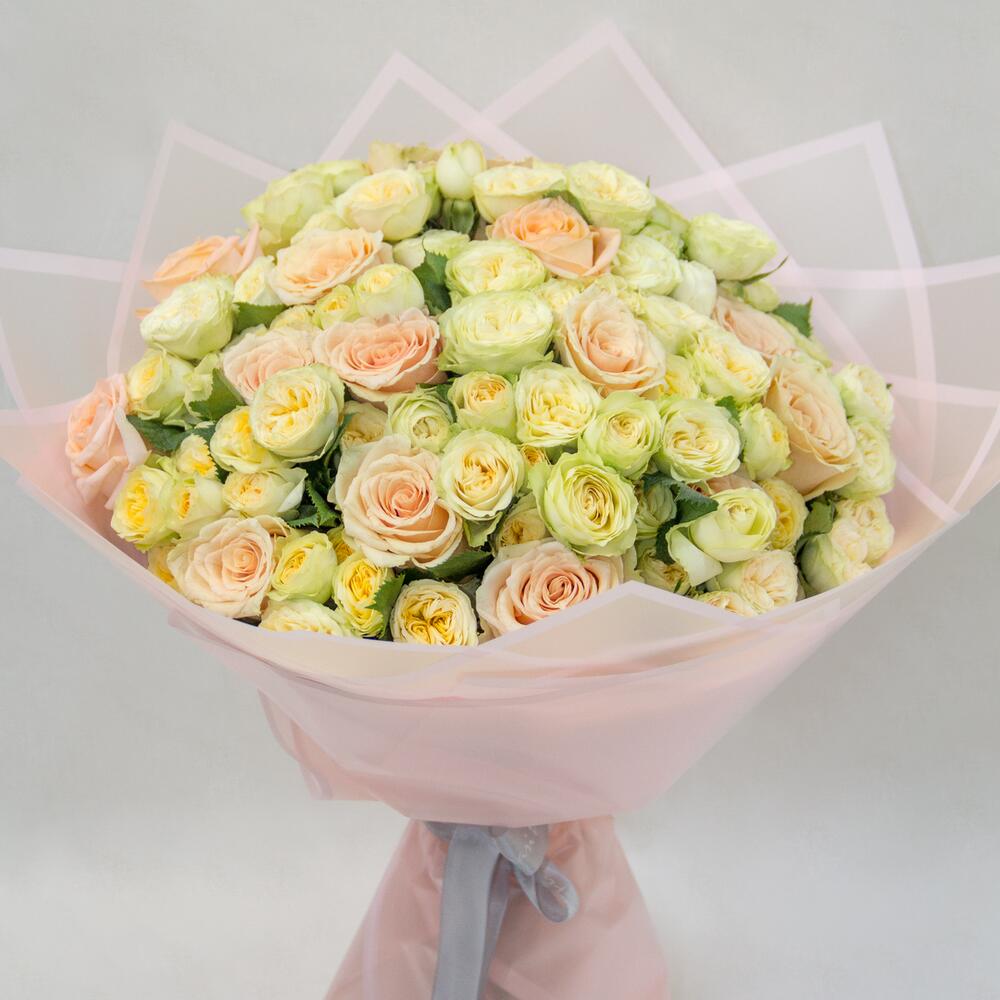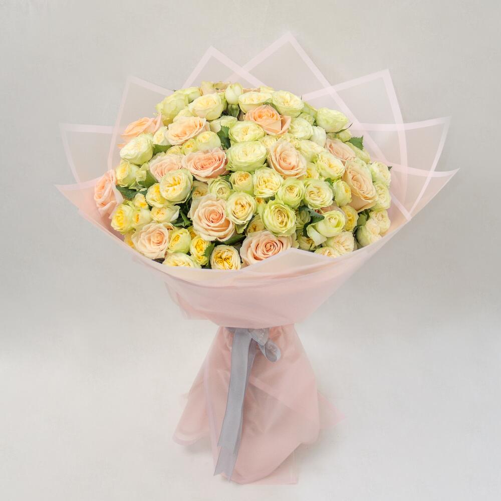 A bouquet of peach roses and spray roses, wrapped in pink wrapping.