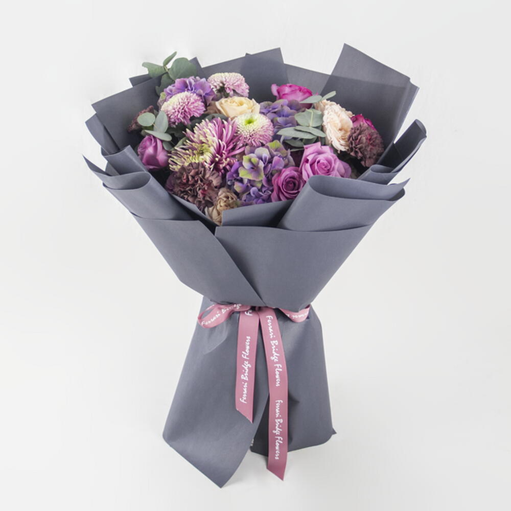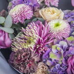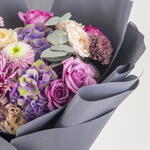 A hand hand bouquet of chrysanthemum, carnations, hydrangea and roses
