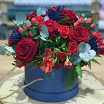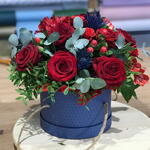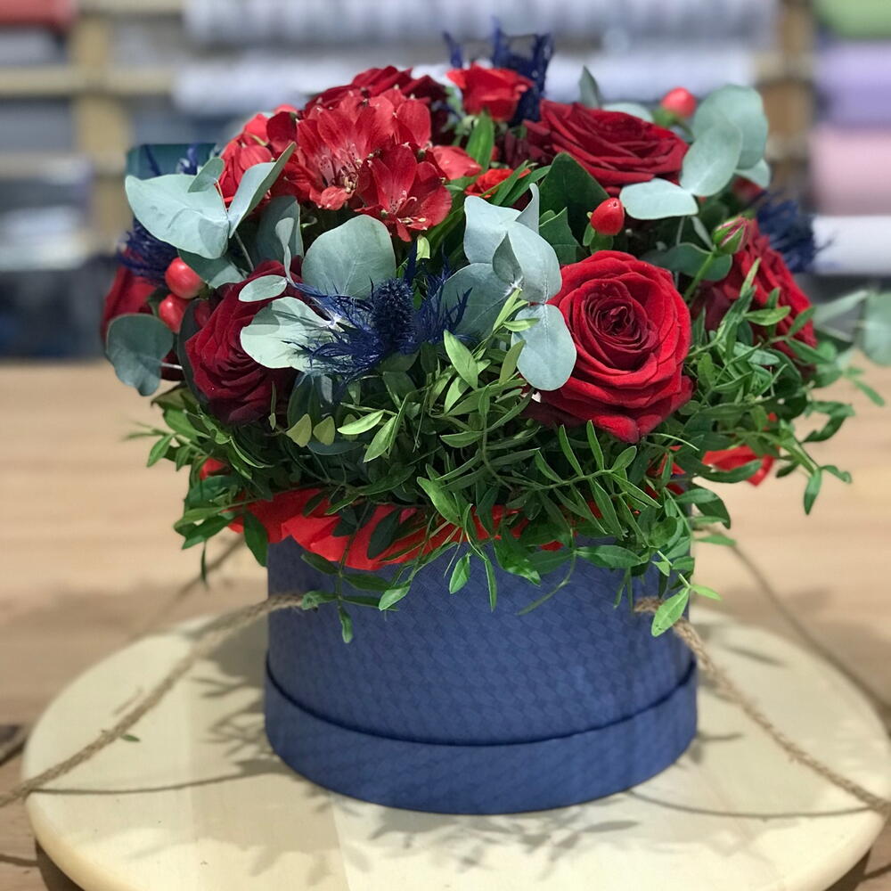 Alstroemeria - 3 db. eukaliptusz - 5 db. orbáncfű - 3 db. spray rózsa - 3 db. piros rózsák - 10 db. przegorzan kulisty - 5 db. dísznövényzet - 5 db.