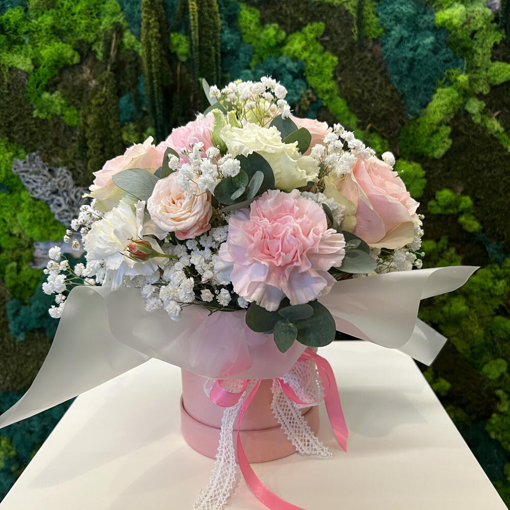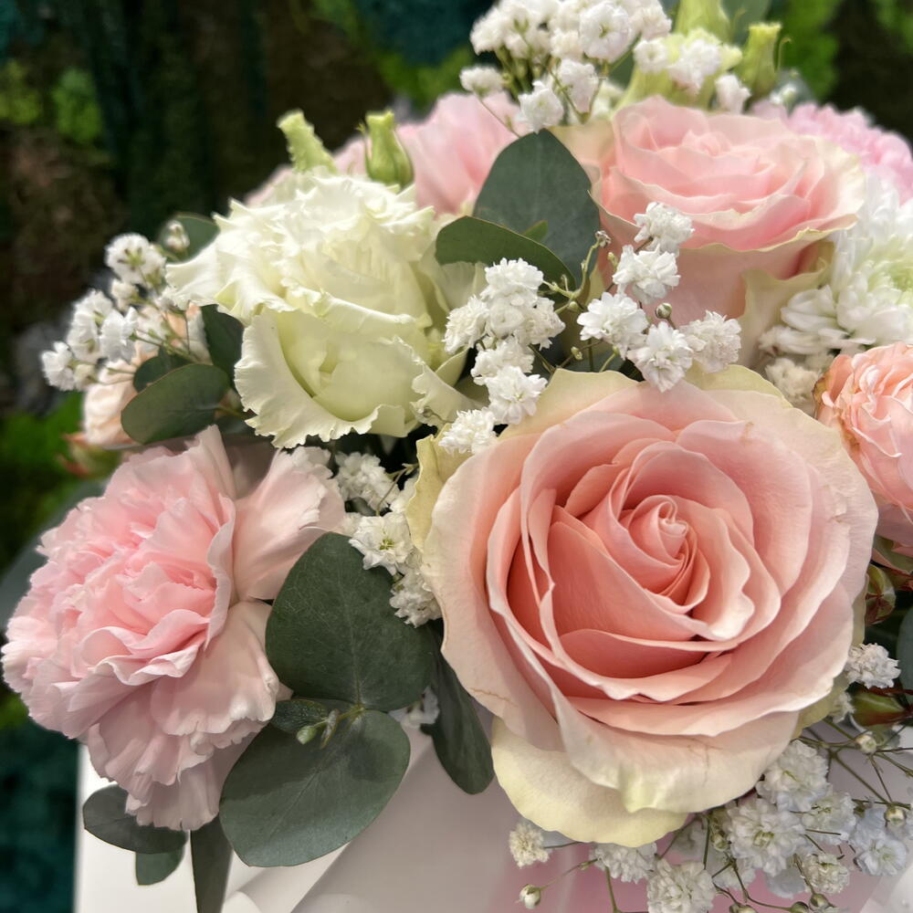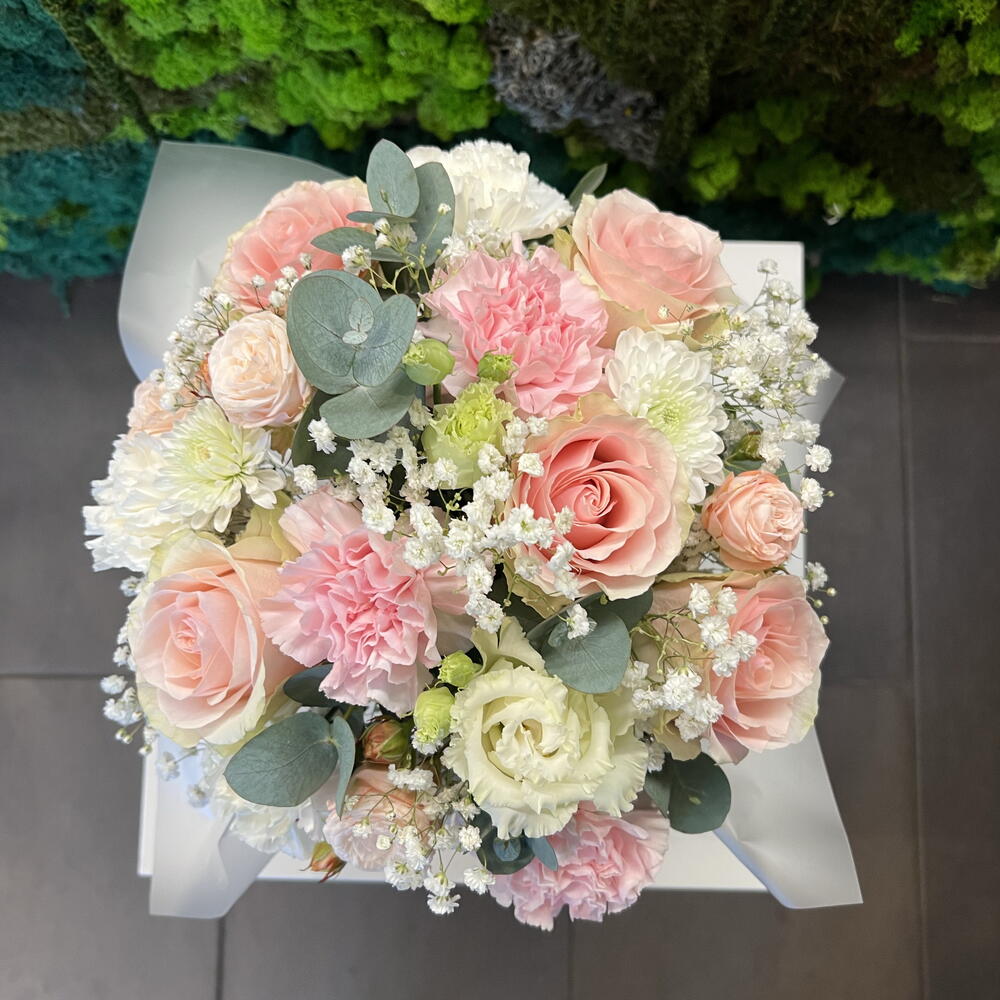 Eustoma - 2 db. Krizantém - 1 db. szegfű - 5 db. gypsophila - 2 db. eukaliptusz - 4 db. virágdoboz - 1 db. dekoratív papír - 1 db. szalag - 2 db. bombasztikus rózsa - 2 db. virágkötészeti szivacs - 1 db. rózsa frutteto - 5 db.