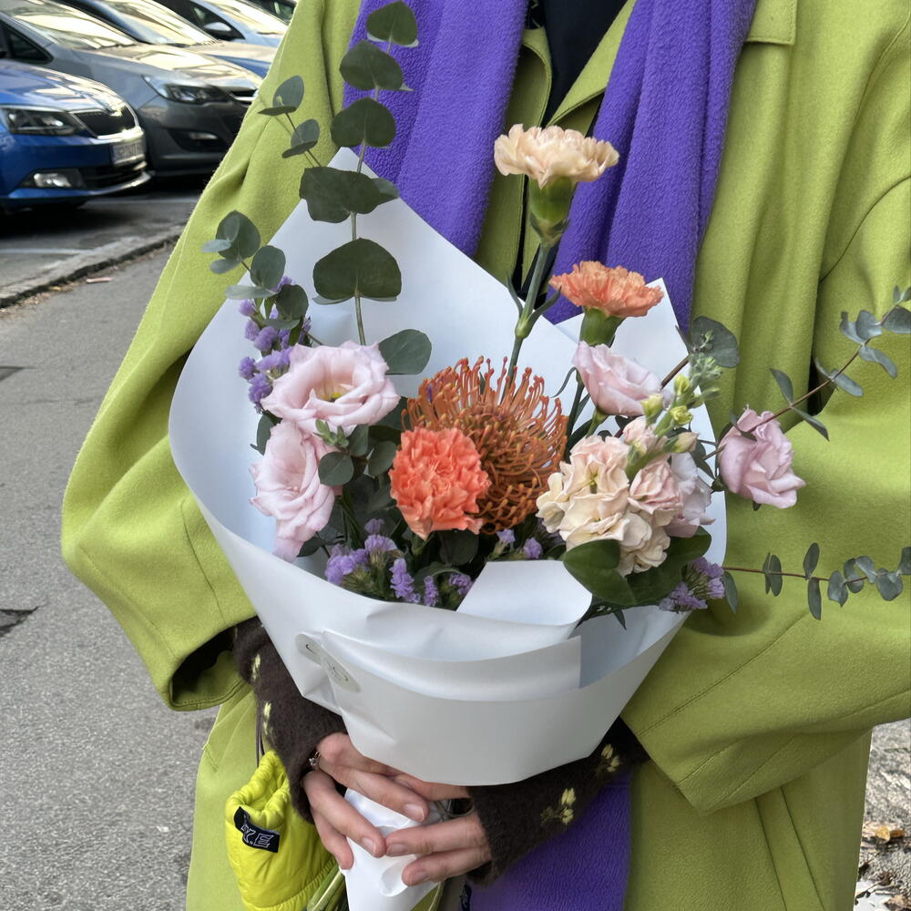 Tengeri levendula - 2 db. Eustoma - 2 db. szegfű - 3 db. mathiola - 1 db. nutan - 1 db. euvcaliptus - 2 db.