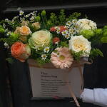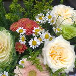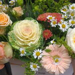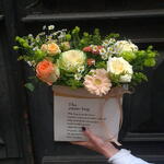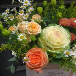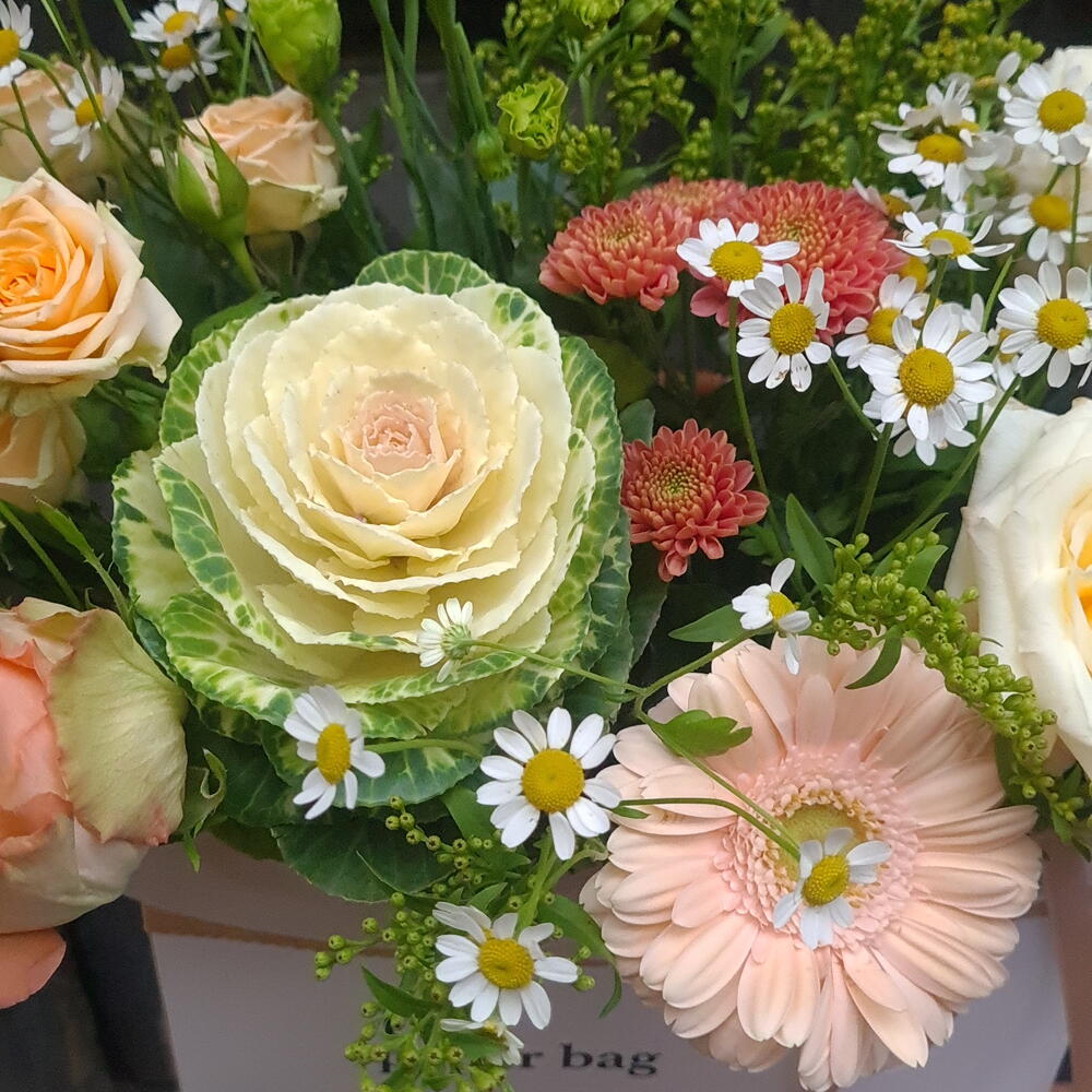 Eustoma - 1 db. Zöld növényzet - 1 db. Doboz - 1 db. Krizantém - 1 db. Aranyvessző - 2 db. Brassica - 1 db. kamilla - 2 db. gerber - 1 db. rózsák - 3 db.